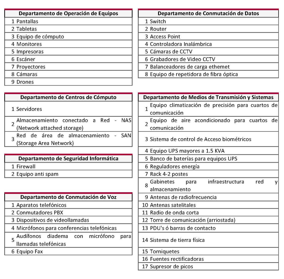 Listado de equipamiento para dictamen de baja que define cada uno de los Departamentos de esta Dirección General de Operación Tecnológica: