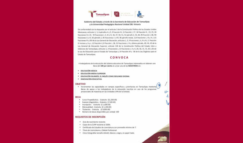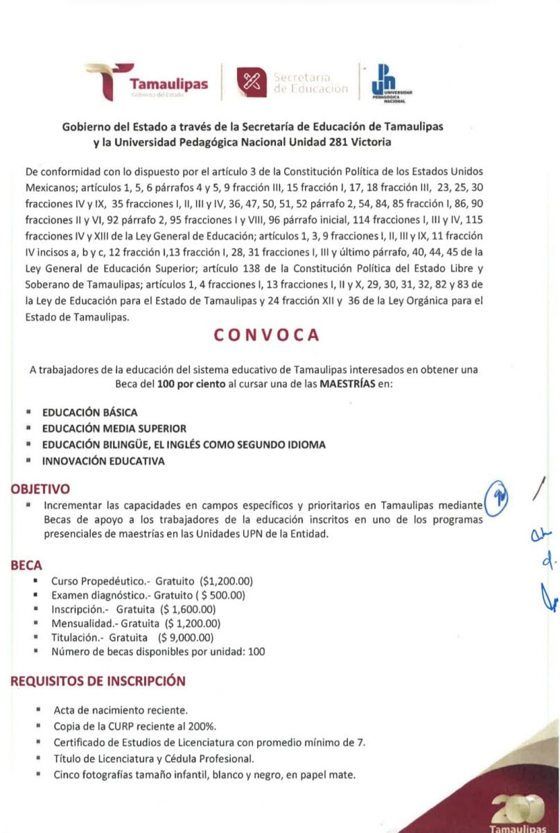 El Gobierno del Estado de Tamaulipas a través de la Secretaría de Educación y la Universidad Pedagógica Nacional Unidad 281 en Ciudad Victoria, convoca. 👇🏼