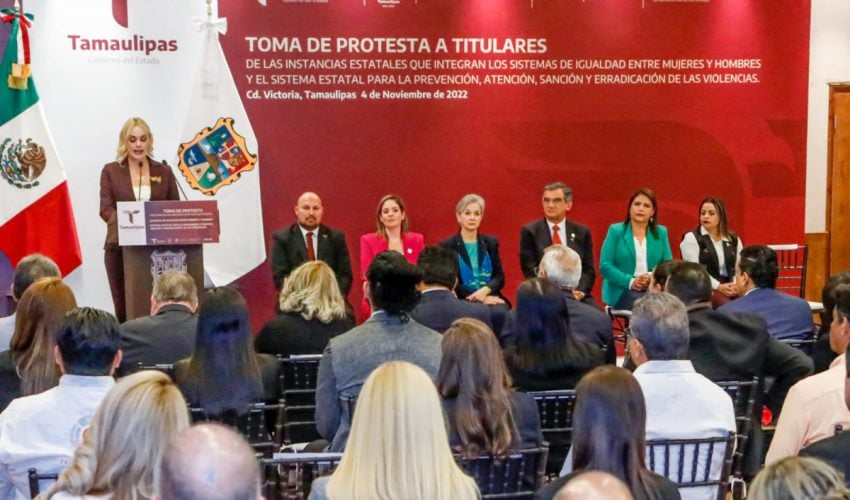 Ciudad Victoria, Tamaulipas.- En el evento en que el Gobernador de Tamaulipas Américo Villarreal Anaya tomó la protesta a quienes se encargarán de mantener a la entidad libre de violencia contra las niñas y mujeres, la presidenta del DIF Tamaulipas, María de Villarreal, fue testigo del compromiso que desde diferentes instancias se trabajará para lograr los objetivos trazados en la materia.