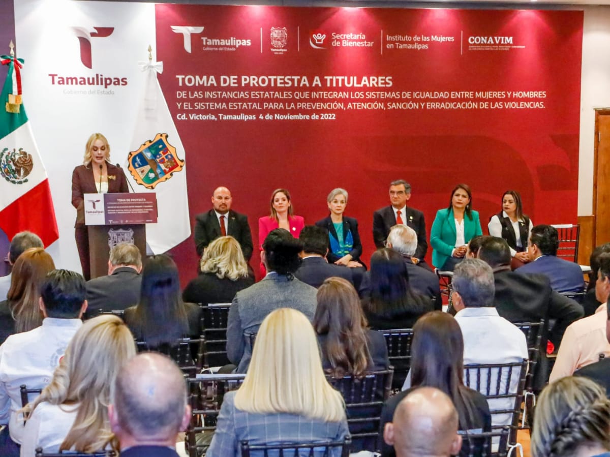 Ciudad Victoria, Tamaulipas.- En el evento en que el Gobernador de Tamaulipas Américo Villarreal Anaya tomó la protesta a quienes se encargarán de mantener a la entidad libre de violencia contra las niñas y mujeres, la presidenta del DIF Tamaulipas, María de Villarreal, fue testigo del compromiso que desde diferentes instancias se trabajará para lograr los objetivos trazados en la materia.