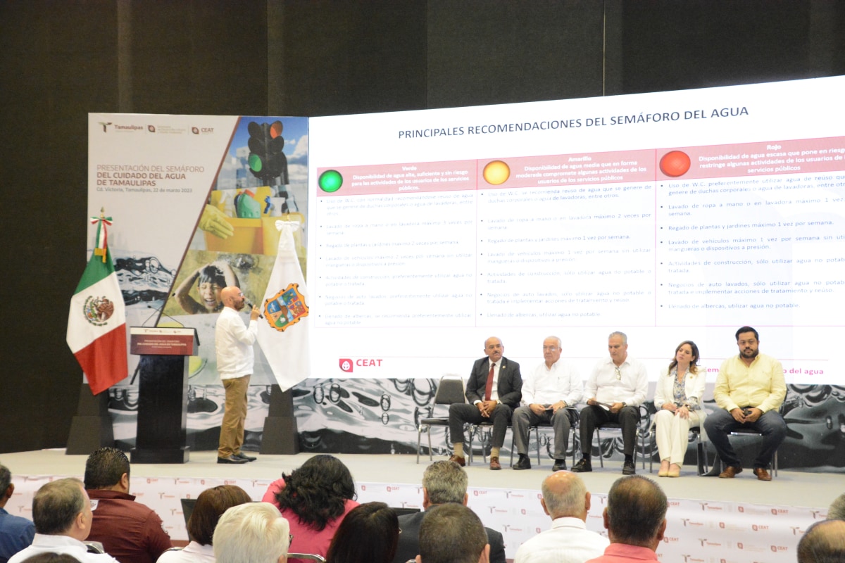 Ciudad Victoria, Tamaulipas.- Con el objetivo de que la ciudadanía tamaulipeca tenga conocimiento de la situación real de la problemática de la falta del vital líquido y de su abastecimiento, la Dirección General de la Comisión Estatal del Agua de Tamaulipas, por instrucción del gobernador Américo Villarreal Anaya, realizó la presentación del Semáforo del Cuidado del Agua en Tamaulipas, el cual se efectúo en el marco del «Día Mundial del Agua», celebrado este miércoles 22 de marzo.