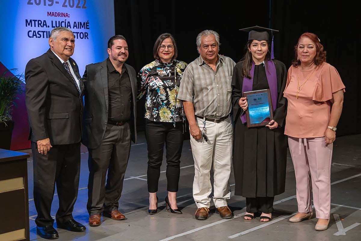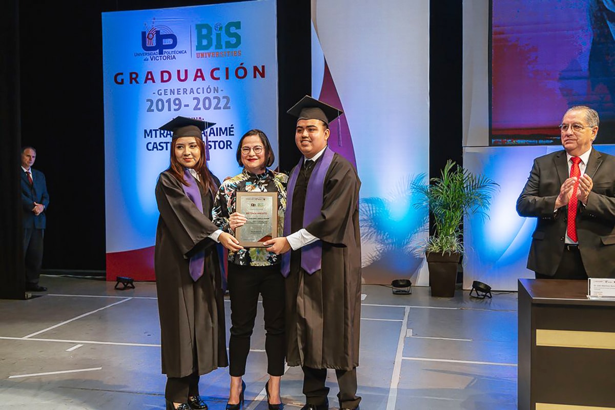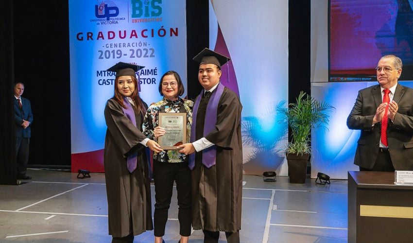 También entregó cinco reconocimientos a Lizvett Deyanira Garza Chávez, de la Ingeniería de Manufactura de Modalidad Bilingüe, con un promedio de 98.11; Edgardo Martínez Núñez, Ingeniería en Tecnología de Manufactura modalidad en español, con un promedio de 96.3; Tomás Adrián Amaro Cervantes, Ingeniería en Sistemas Automotrices, con un promedio 97.77; Karelly Rivera López, de Ingeniería Mecatrónica con promedio de 97.36; Isaac de Jesús Becerra Martínez, de Ingeniería en Tecnologías de la Información, con un promedio de 97.55; Olga Alondra Echartea Reyes y Miguel Ángel Rubio Padrón, de Posgrado Maestría en Ingeniería, con un promedio en empate de 98.25.