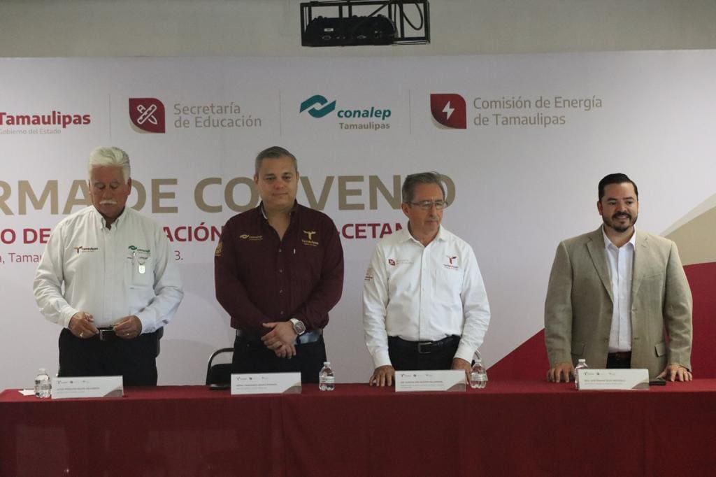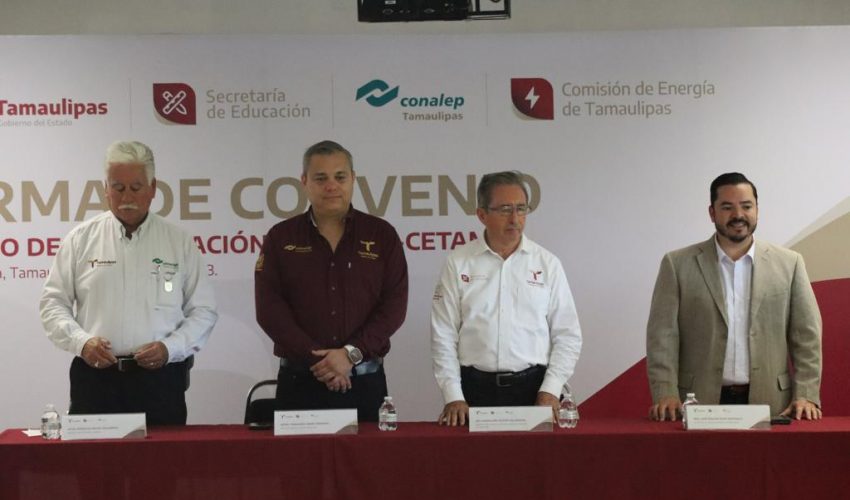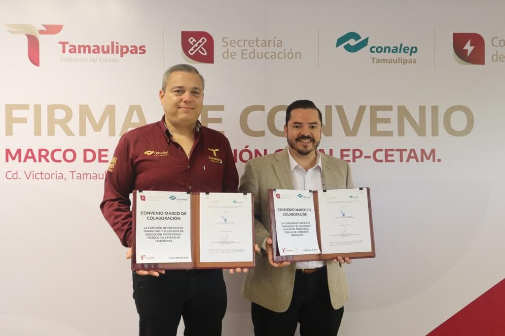 Ciudad Victoria, Tamaulipas.– Con el objetivo de establecer un marco de cooperación común e institucional que fortalezca el aprovechamiento del potencial energético en Tamaulipas, se firmó un convenio marco de colaboración entre el Colegio Nacional de Educación Profesional (CONALEP) Tamaulipas y la Comisión de Energía de Tamaulipas (CETAM).