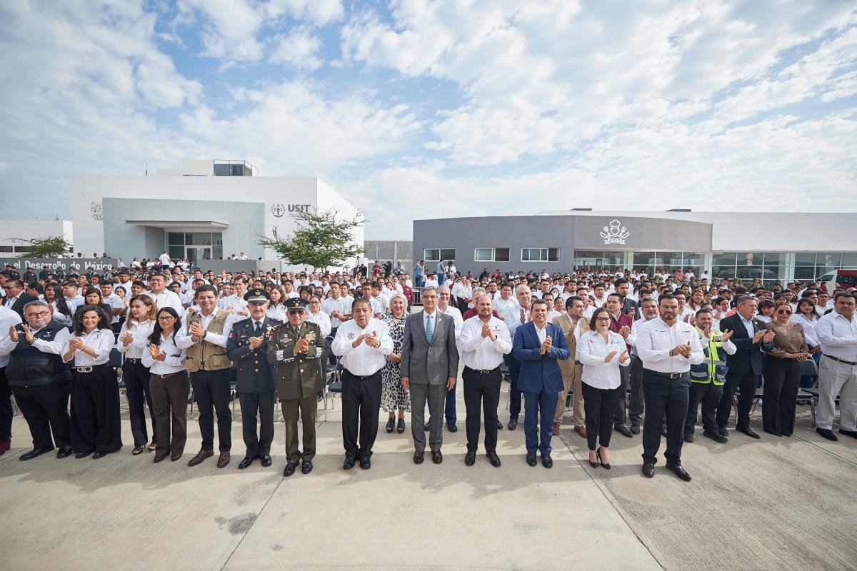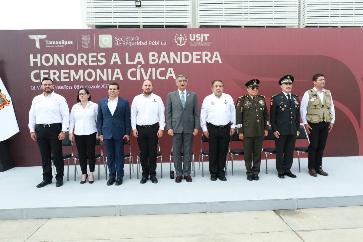 Estuvieron junto al gobernador en el presidium, el general Elpidio Canales Rosas comandante de la 48a. Zona Militar; el general Adalberto Rojas Mira, coordinador estatal de la Guardia Nacional; el secretario general de Gobierno, Héctor Joel Villegas González; la secretaria de Educación, Lucía Aimé Castillo Pastor; el alcalde de Victoria, Eduardo Gattás Báez; el delegado de Programas Federales para el Desarrollo, Luis Lauro Reyes Rodríguez y Willly Zúñiga Castillo, rector de la Universidad de Seguridad y Justicia, además de funcionarios del gabinete estatal.