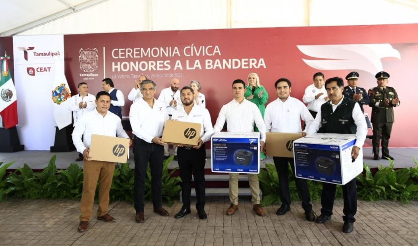 Durante la ceremonia de honores, el mandatario estatal también entregó 12 equipos de cómputo a David Alberto García Pérez, jefe de la Unidad Operativa 16, de precios de garantía y estímulos de SEGALMEX, y anunció el inicio de la distribución de 9 mil toneladas de fertilizantes provenientes de los programas federales, sobre todo en beneficio de pequeños propietarios.