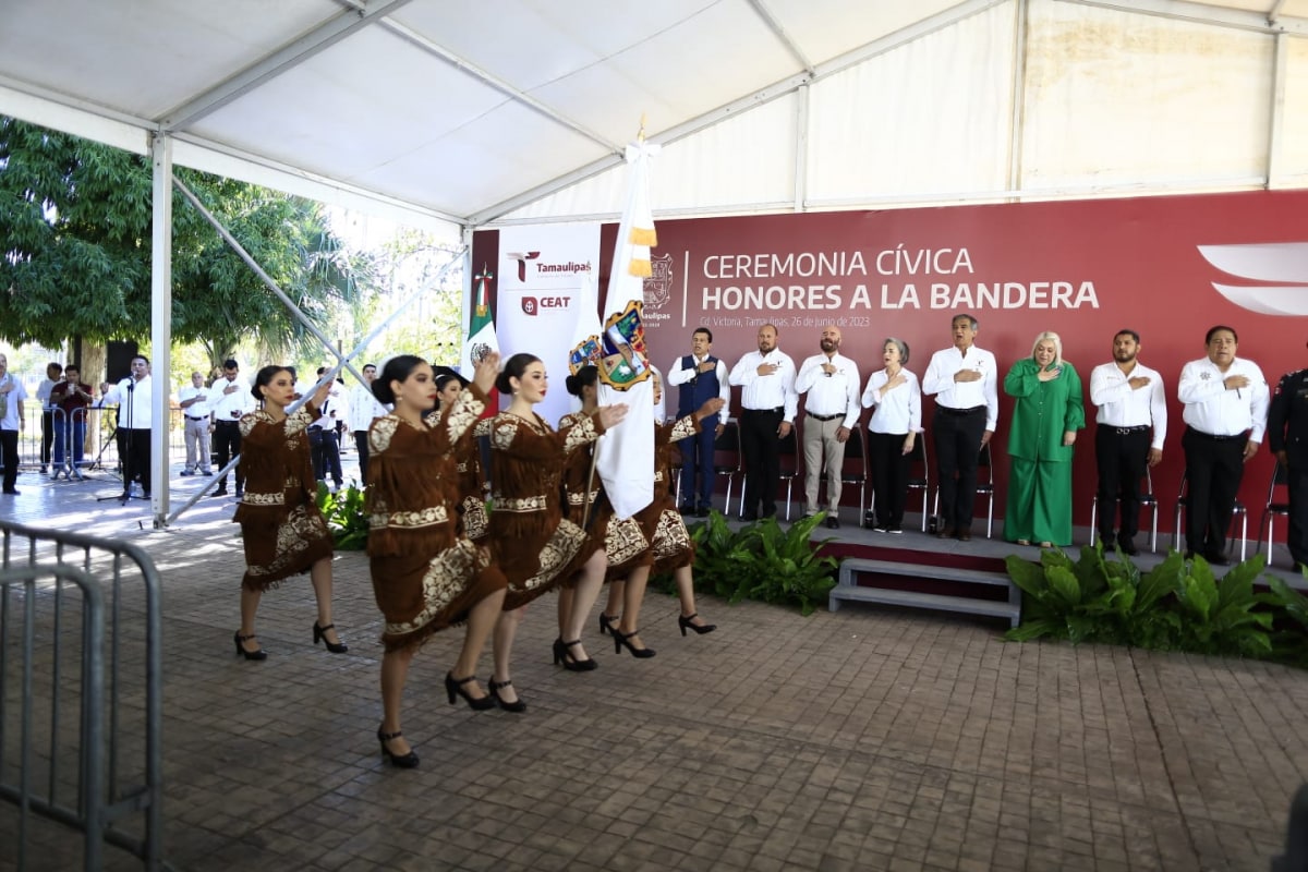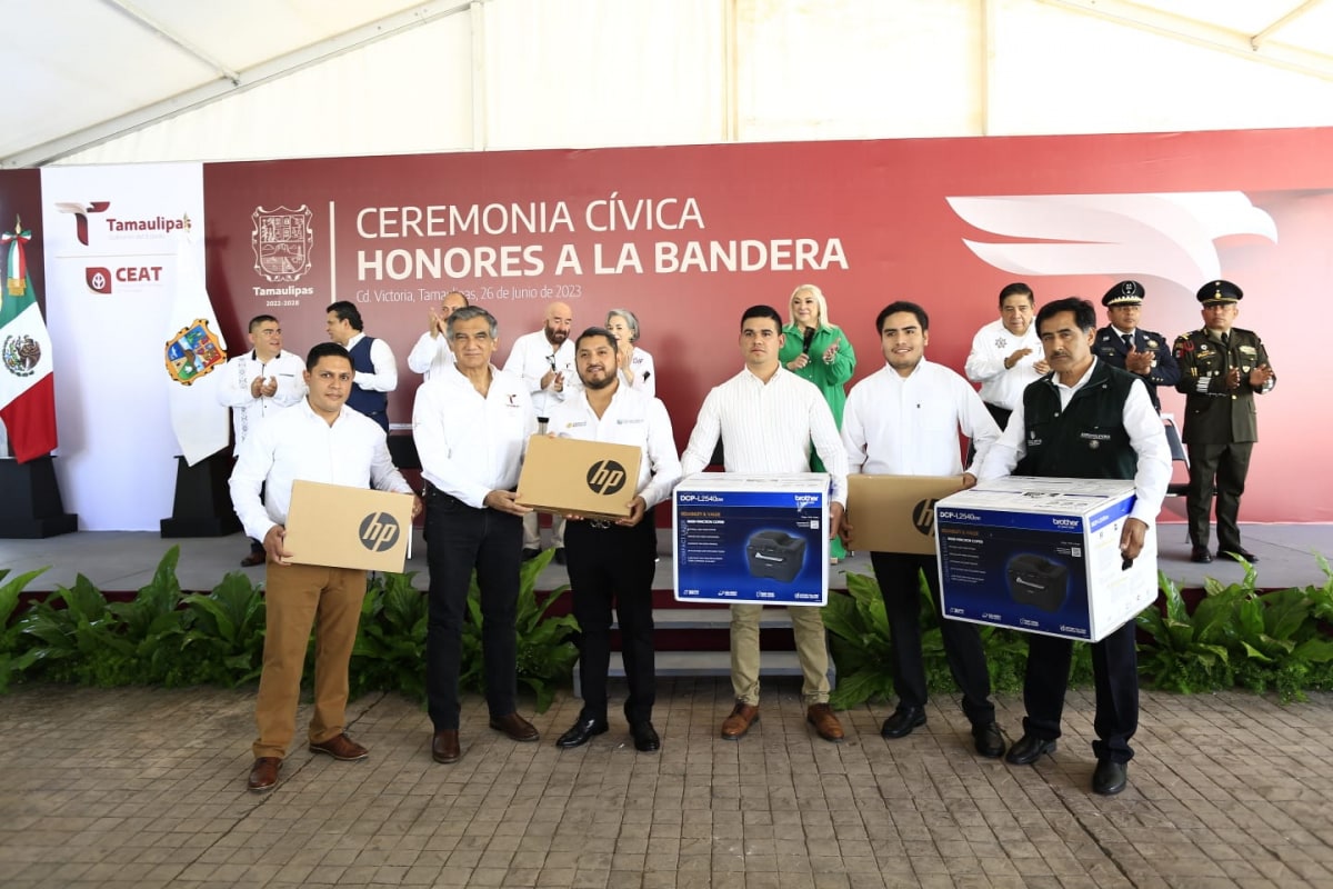 Durante la ceremonia de honores, el mandatario estatal también entregó 12 equipos de cómputo a David Alberto García Pérez, jefe de la Unidad Operativa 16, de precios de garantía y estímulos de SEGALMEX, y anunció el inicio de la distribución de 9 mil toneladas de fertilizantes provenientes de los programas federales, sobre todo en beneficio de pequeños propietarios.