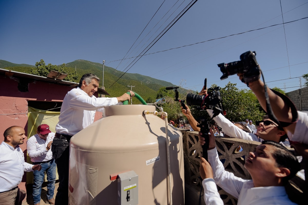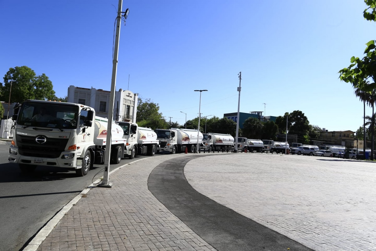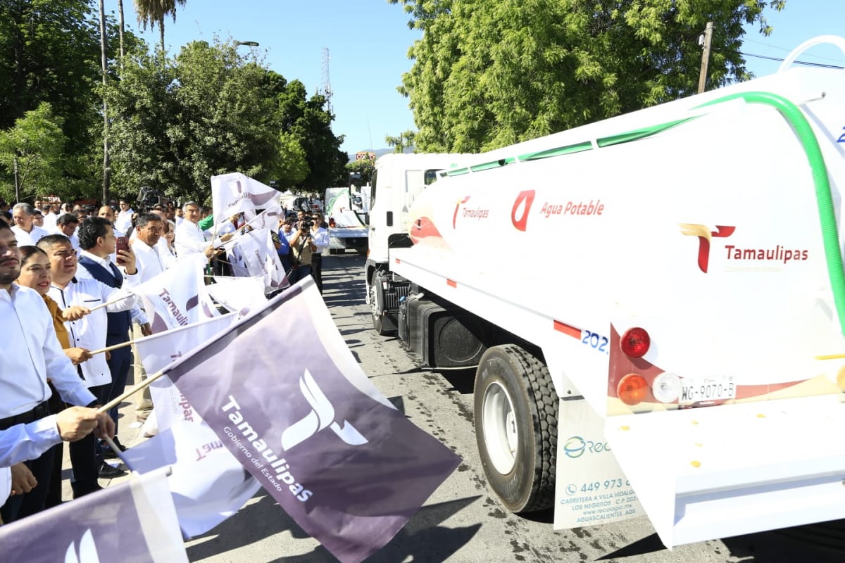 Durante la ceremonia cívica de honores, celebrada en el Paseo Pedro J. Méndez y acompañado por la presidenta del DIF estatal, María Santiago de Villarreal, el gobernador dio el banderazo de salida a los 12 camiones, unos con capacidad de diez mil litros, otros con capacidad de veinte mil litros y después llegó hasta las calles de la periferia, en la colonia Ampliación Luis Echeverría, enclavada en la Sierra Madre, en donde personalmente llenó tinacos y tanques de almacenamiento con el vital líquido.