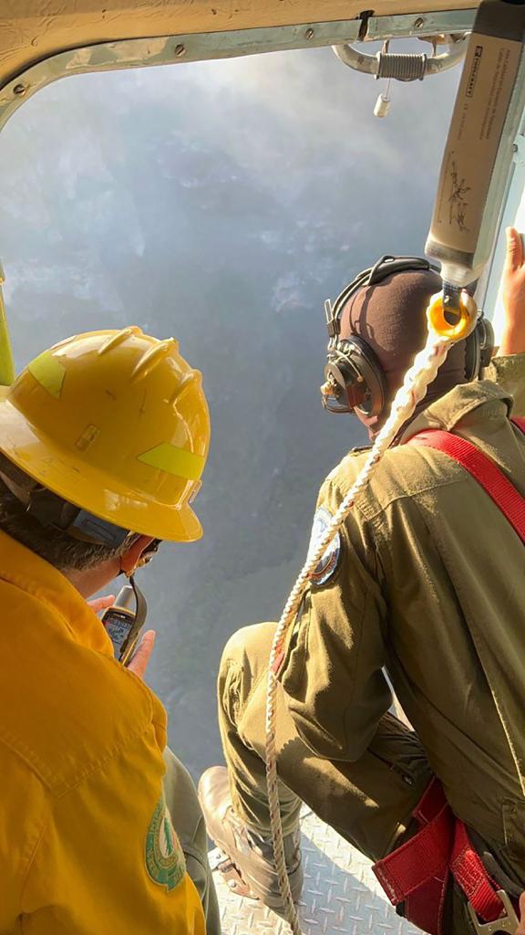 Durante el recorrido aéreo, participó personal de Protección Civil Estatal, de la Secretaría de Desarrollo Rural, la Comisión Nacional Forestal, la Secretaría de la Defensa Nacional y del Gobierno Municipal, quienes día y noche durante más de 15 días, realizaron acciones conjuntas para evitar que el siniestro se extendiera.