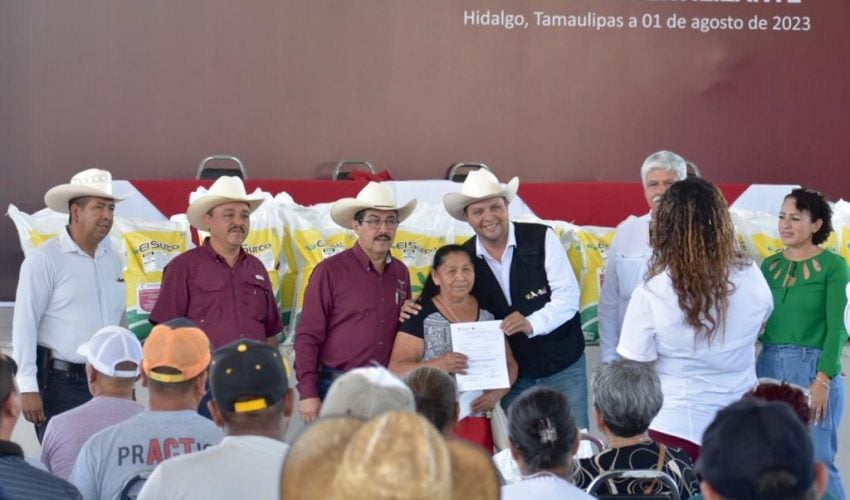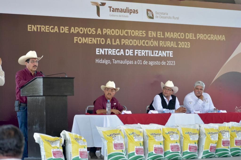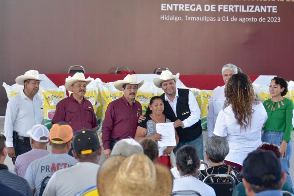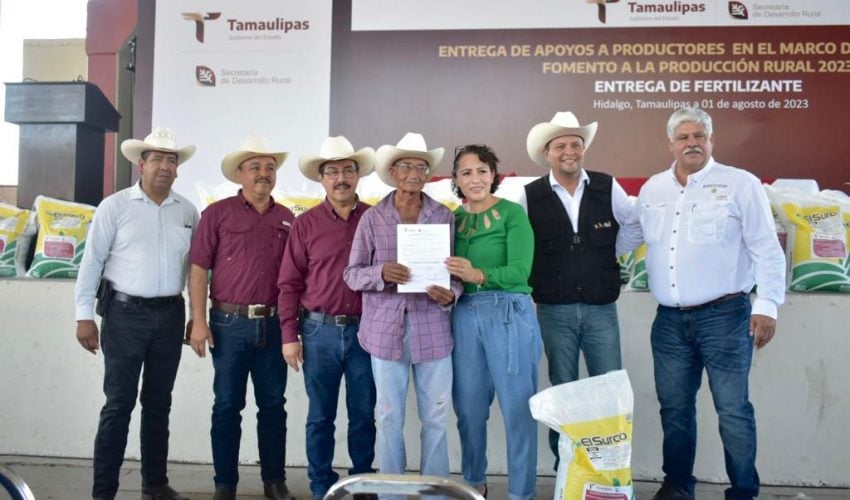 Hidalgo, Tamaulipas.- Un total de 50 toneladas de fertilizante de la variedad MAP fueron entregadas a productores citrícolas de los municipios de Hidalgo y Villagrán, esto como parte del compromiso que tiene el gobernador Américo Villarreal Anaya con los agricultores de fortalecer la actividad citrícola del estado.
