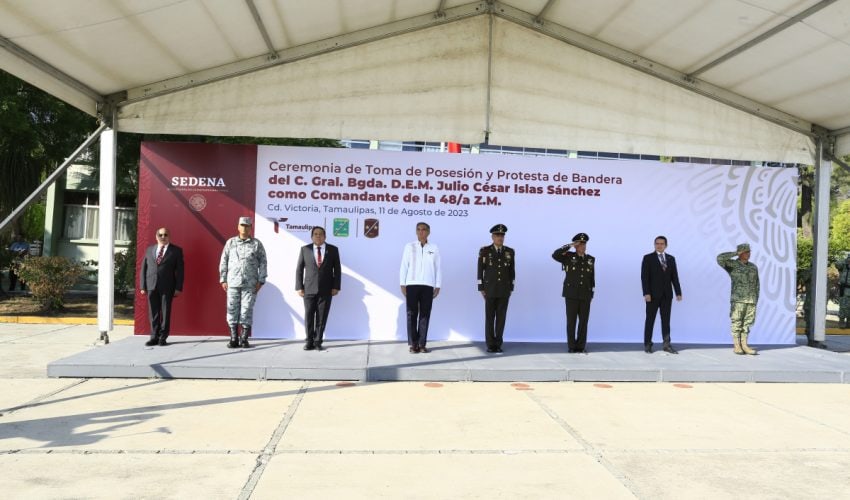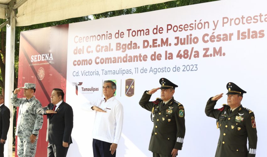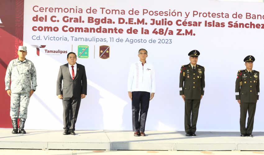 Ciudad Victoria, Tamaulipas.- El gobernador Américo Villarreal Anaya asistió a la toma de posesión y protesta de bandera del general de brigada Diplomado de Estado Mayor, Julio César Islas Sánchez como nuevo comandante de la 48/a Zona Militar, la cual cubre 28 municipios de Tamaulipas.