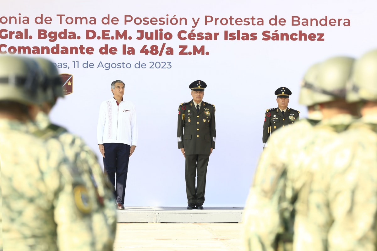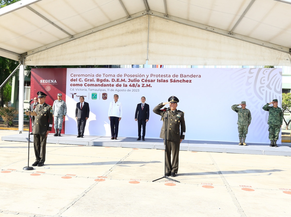 Ciudad Victoria, Tamaulipas.- El gobernador Américo Villarreal Anaya asistió a la toma de posesión y protesta de bandera del general de brigada Diplomado de Estado Mayor, Julio César Islas Sánchez como nuevo comandante de la 48/a Zona Militar, la cual cubre 28 municipios de Tamaulipas.