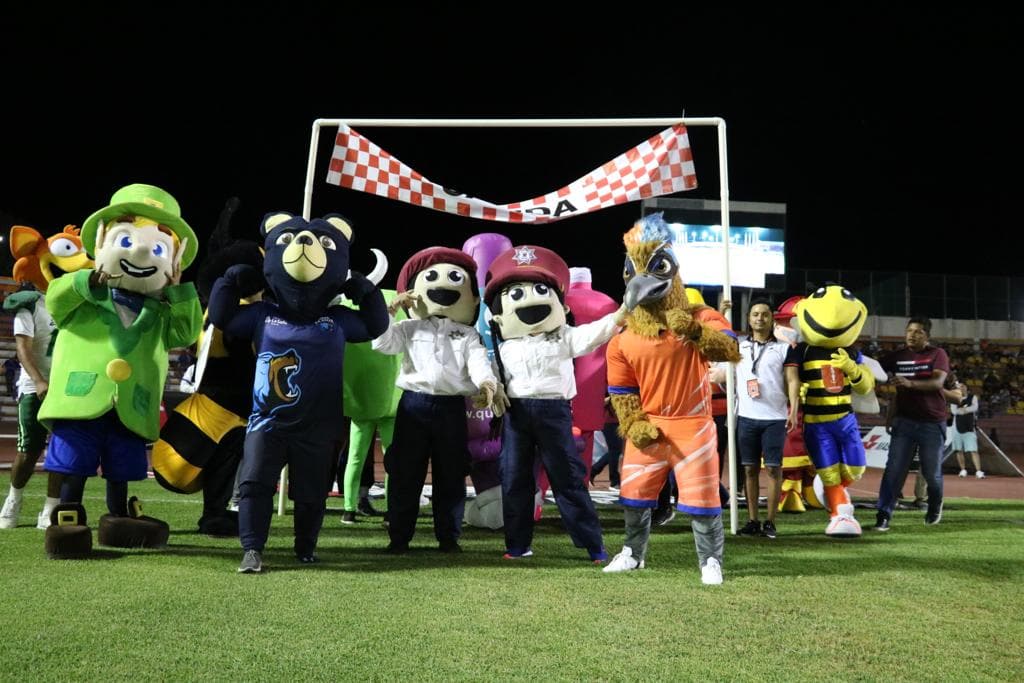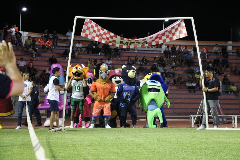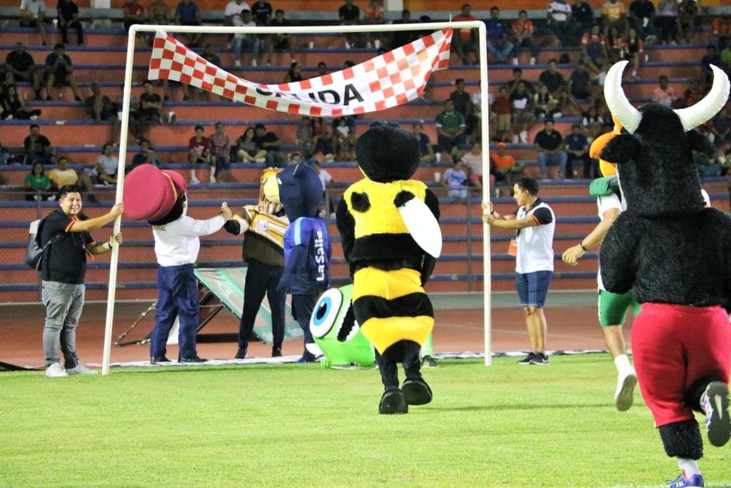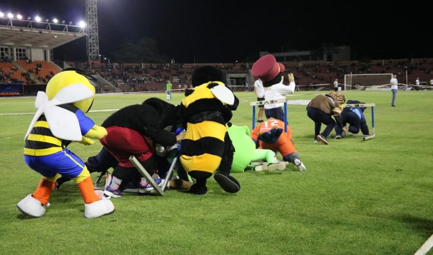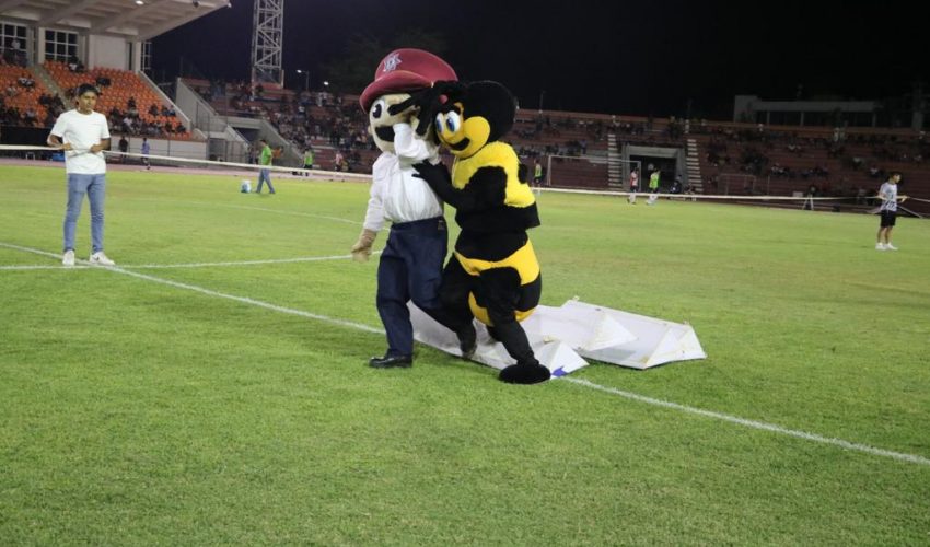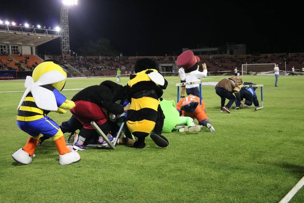 Ciudad Victoria, Tamaulipas.- Coronel Justicia y Capitana Honradez, botargas oficiales de la Secretaría de Seguridad Pública de Tamaulipas (SSPT) atendieron la invitación del Club de Futbol Correcaminos y participaron en el espectáculo de medio tiempo del partido contra el equipo Tapatío que consistió en una carrera de botargas.