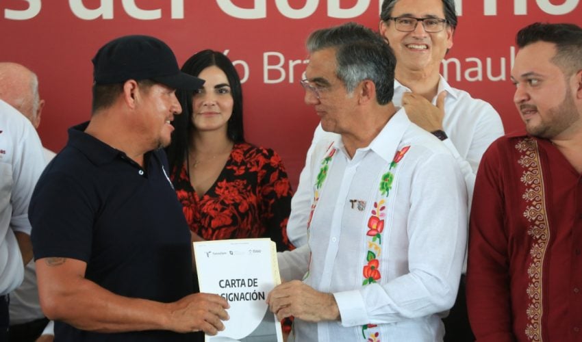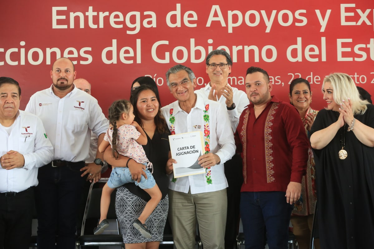 Acompañado por el alcalde Joel Eduardo Yáñez Villegas y por integrantes del gabinete estatal, el mandatario tamaulipeco entregó 100 certificados de condonación de intereses moratorios de la delegación Valle Hermoso, además de 552 cartas de asignación del Fraccionamiento Unidos Avanzamos de Río Bravo y 50 cartas de asignación de lotes a este municipio.