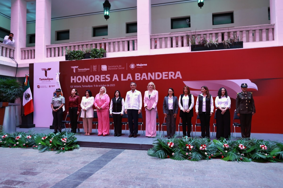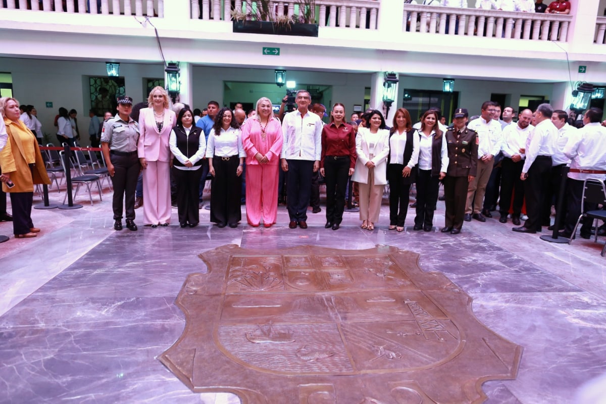 Tras citar a mujeres que se destacaron por diversas aportaciones como Gertrudis Bocanegra, Estefanía y Teodosia Castañeda, así como a Rita Cetina, el mandatario estatal también se refirió a la inclusión del escudo de Tamaulipas en el punto central del patio, colocado como parte de un proceso de restauración del edificio, símbolo del patrimonio de las y los tamaulipecos.