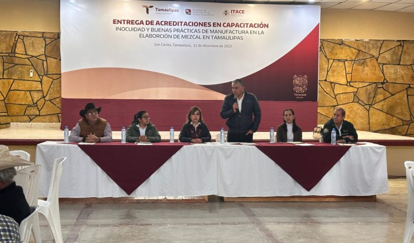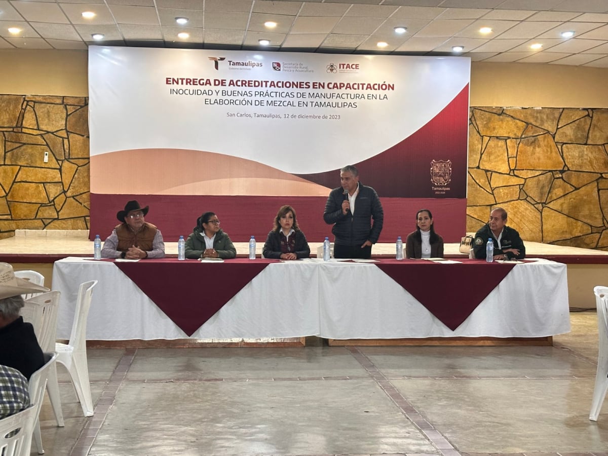 San Carlos, Tamaulipas. -La Secretaría de Desarrollo Rural, Pesca y Acuacultura, encabezada por Antonio Varela Flores, a través de la Dirección de Fomento Forestal llevó a cabo la entrega de acreditaciones en capacitación «Inocuidad y Buenas Prácticas de Manufactura en la Elaboración de Mezcal en Tamaulipas», a un grupo de productores de mezcal del municipio de San Carlos.