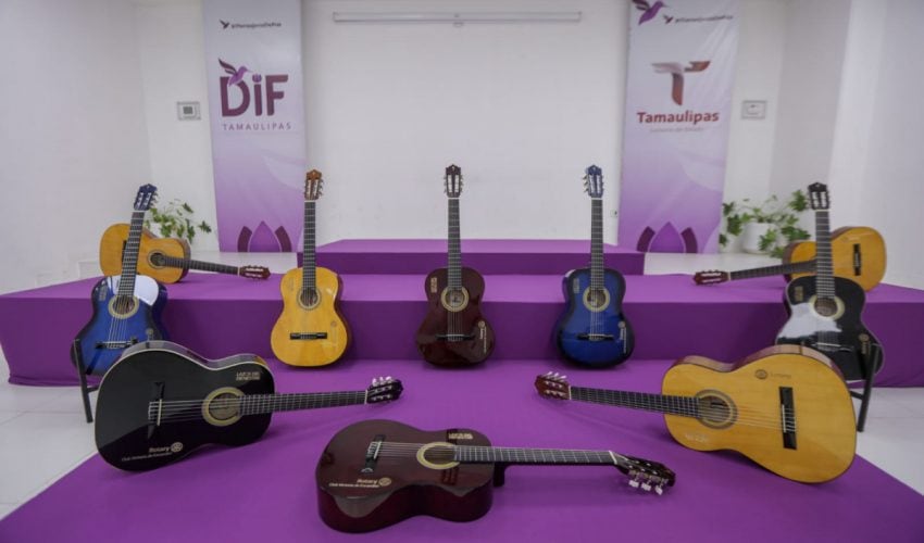 Ciudad Victoria, Tamaulipas. Para impulsar el arte y la cultura a través del aprendizaje musical a niñas, niños, adolescentes y jóvenes de los polígonos del programa “Lazos del Bienestar”, el Sistema DIF Tamaulipas que preside la doctora María de Villarreal, recibió un donativo de instrumentos musicales consistentes en guitarras acústicas por parte de las autoridades del Club Rotario Victoria de Escandón.