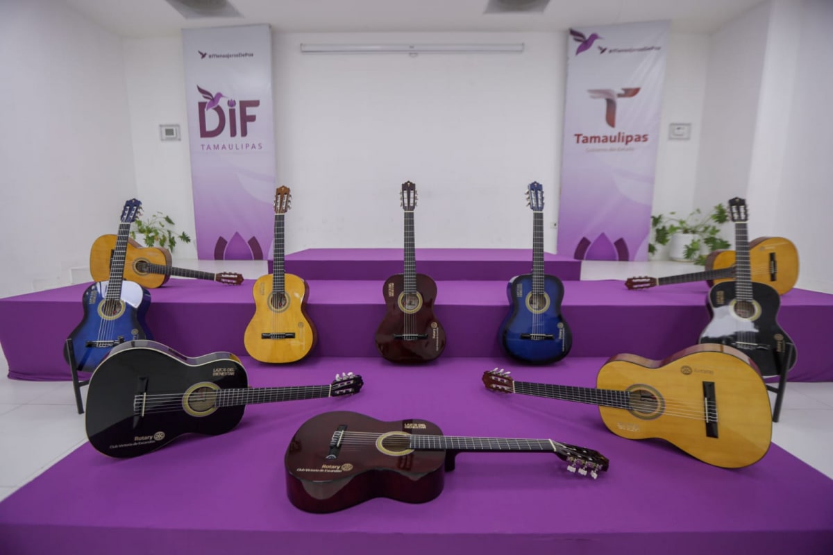 Ciudad Victoria, Tamaulipas. Para impulsar el arte y la cultura a través del aprendizaje musical a niñas, niños, adolescentes y jóvenes de los polígonos del programa “Lazos del Bienestar”, el Sistema DIF Tamaulipas que preside la doctora María de Villarreal, recibió un donativo de instrumentos musicales consistentes en guitarras acústicas por parte de las autoridades del Club Rotario Victoria de Escandón.
