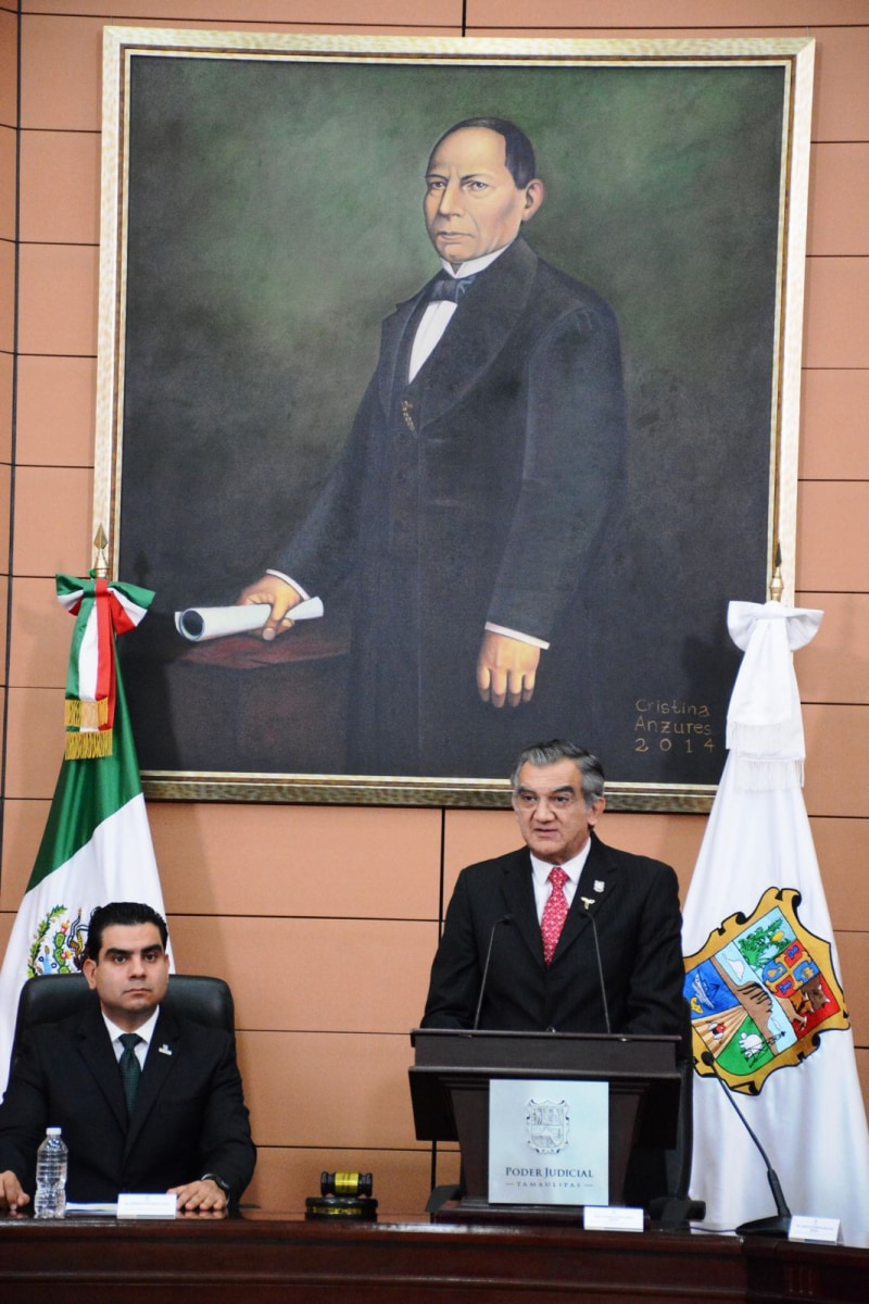 Ante el pleno del Poder Judicial del Estado, de la presidenta de la Junta de Coordinación Política del Congreso del Estado, diputada Úrsula Salazar Mojica, jueces y servidores públicos, mandos de las fuerzas militares, presidentes de colegios de profesionales,  e invitados especiales, el gobernador Américo Villarreal convocó a implementar una justicia cercana, eficaz y eficiente, que responda a las exigencias de nuestros tiempos y reiteró su compromiso para seguir buscando los consensos a fin de fortalecer las funciones vitales del Estado, además de proteger la legalidad y restaurar la confianza de la sociedad hacia sus autoridades.