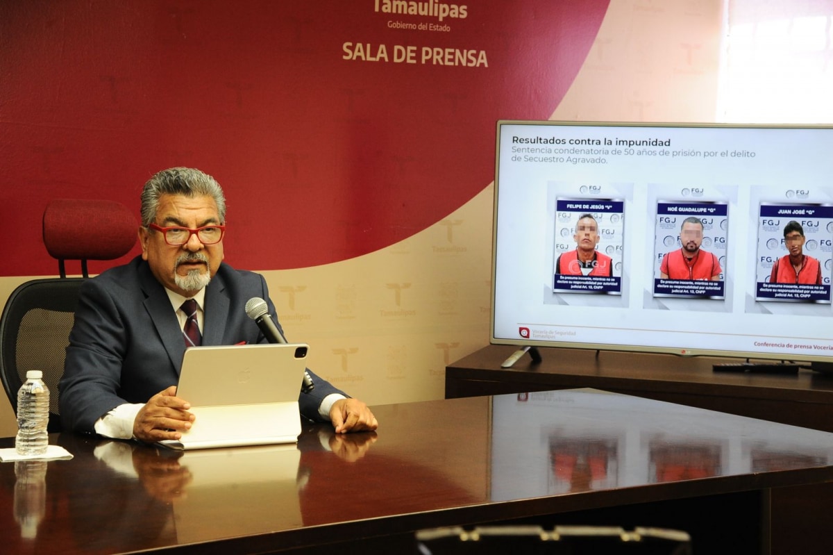 En las acciones del combate a la impunidad, el vocero se refirió a la sentencia condenatoria por 50 años de prisión para Felipe de Jesús «V», Noé de Guadalupe «G» y Juan José «G», por el delito de secuestro agravado; también a la sentencia condenatoria por 50 años a Jaime «M» por el delito de violación agravada a una menor de edad y la sentencia condenatoria por 15 años y 6 meses de prisión en contra de Eduardo Alejandro «T», por el delito de robo a oficina bancaria con violencia, ocurrido en Reynosa.