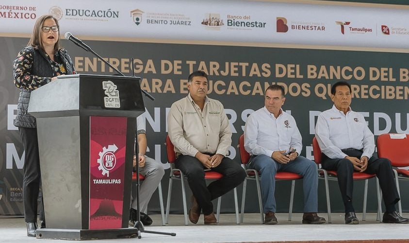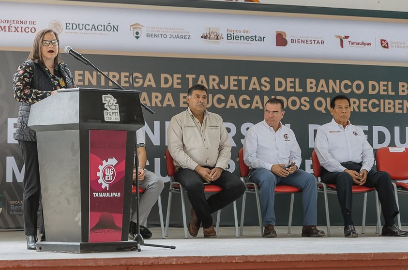 Ciudad Victoria, Tamaulipas.– Ante la presencia de estudiantes, padres de familia y autoridades educativas federales y estatales, Lucía Aimé Castillo Pastor, secretaria de Educación de Tamaulipas, entregó tarjetas del Banco del Bienestar a las y los estudiantes beneficiados con el programa de Becas “Benito Juárez” en la entidad.
