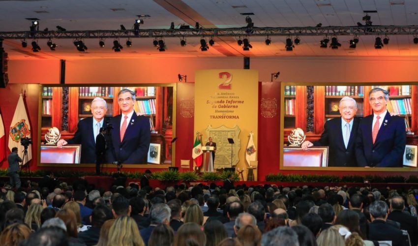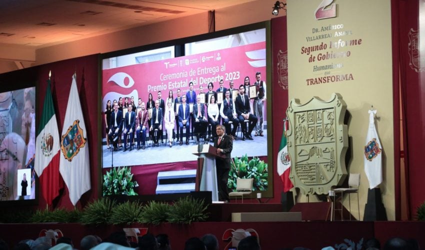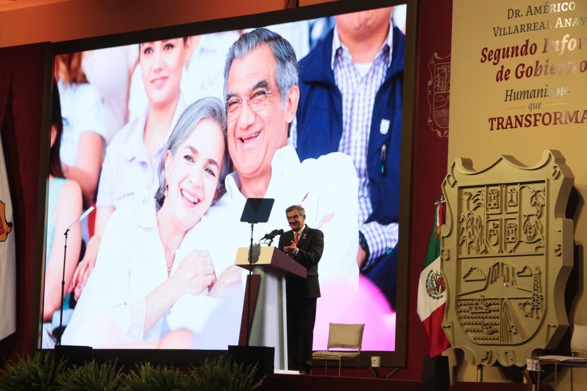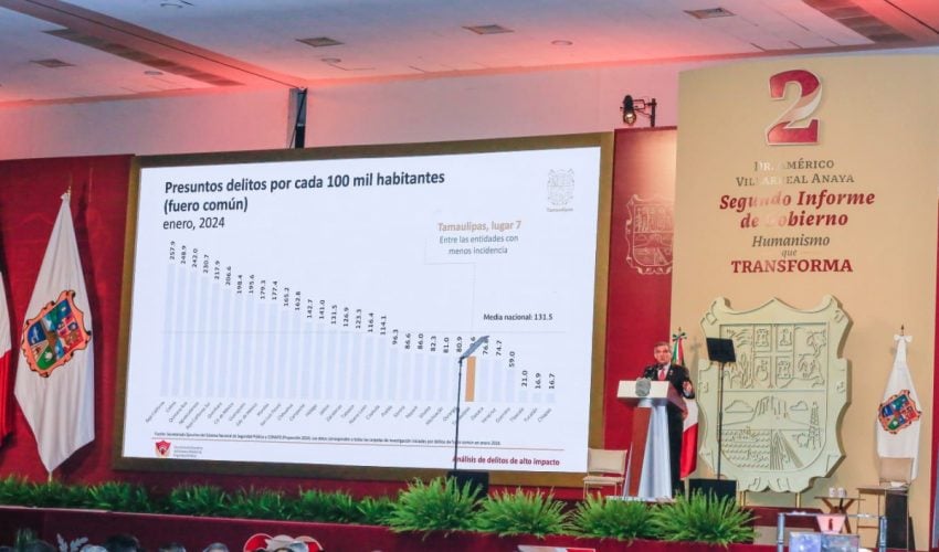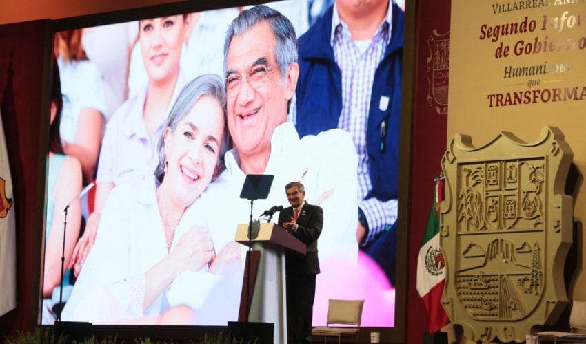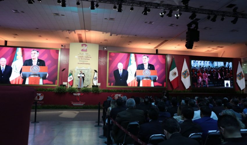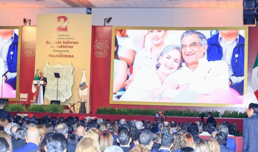 Ante la presencia de la presidenta del DIF, Tamaulipas, María de Villarreal y titulares de los Poderes Legislativo y Judicial, integrantes del gabinete federal, legisladores, mandos militares y de las fuerzas armadas, dirigentes de organismos industriales, cámaras empresariales y representantes de todos los sectores productivos, el mandatario tamaulipeco señaló que el segundo informe entregado este día al Honorable Congreso de Tamaulipas sobre el estado que guarda la administración pública, describe de manera detallada las 857 acciones realizadas, atendiendo a los marcos estratégicos de la planeación democrática y aterrizan en los objetivos de los tres grandes ejes del Plan Estatal de Desarrollo: Gobierno al Servicio del Pueblo, Desarrollo Inclusivo y Sostenible y Política Social para el Bienestar.