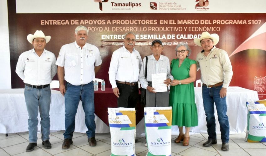 Aldama, Tamaulipas. – En un evento realizado en el municipio de Aldama, el secretario de Desarrollo Rural, Pesca y Acuacultura de Tamaulipas, Antonio Varela Flores, entregó poco más de siete toneladas de semilla de sorgo y maíz, beneficiando a 184 productores que estarán sembrando en promedio 910 hectáreas, con la finalidad de aprovechar la humedad que presentan las tierras a raíz de las precipitaciones pluviales que se presentaron en días pasados.