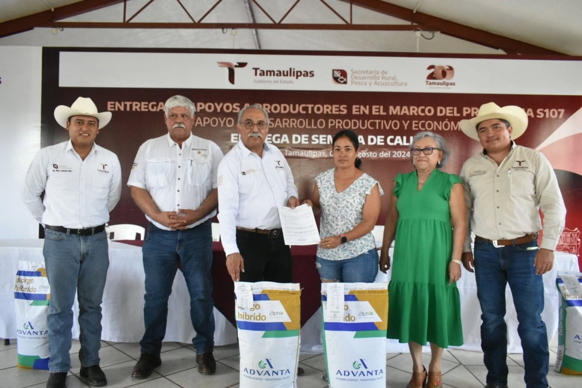 Durante la entrega de apoyos estuvieron presentes Guadalupe Acevedo González, representante de la Secretaría de Agricultura y Desarrollo Rural en Tamaulipas; Cuauhtémoc Amaya García, subsecretario de Desarrollo Pecuario y Forestal, además de funcionarios estatales, municipales y productores beneficiados.