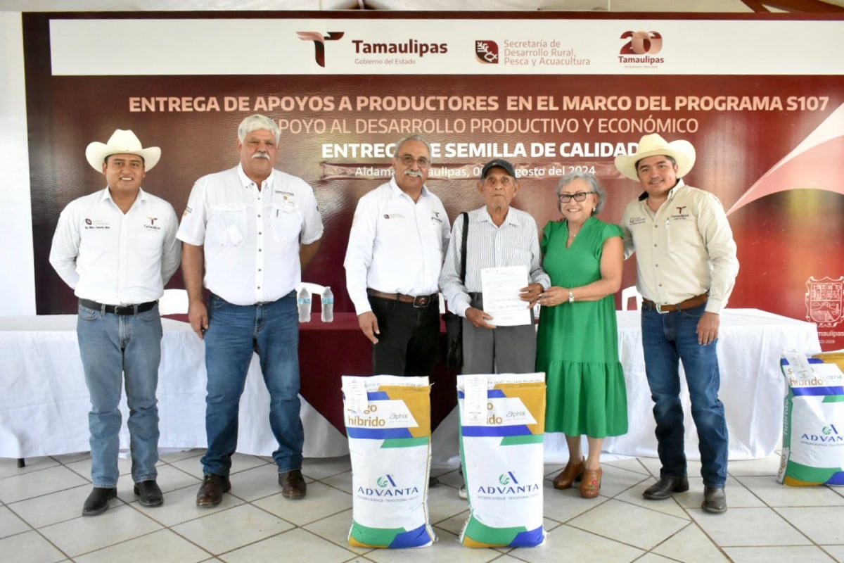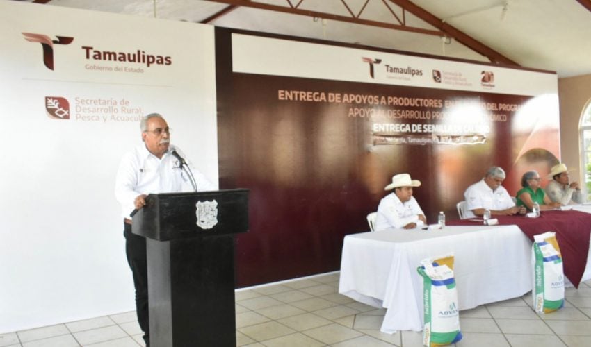 Aldama, Tamaulipas. – En un evento realizado en el municipio de Aldama, el secretario de Desarrollo Rural, Pesca y Acuacultura de Tamaulipas, Antonio Varela Flores, entregó poco más de siete toneladas de semilla de sorgo y maíz, beneficiando a 184 productores que estarán sembrando en promedio 910 hectáreas, con la finalidad de aprovechar la humedad que presentan las tierras a raíz de las precipitaciones pluviales que se presentaron en días pasados.
