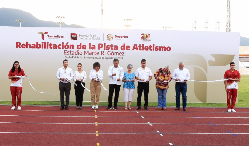 Enseguida, el gobernador y su esposa se encaminaron al estadio Marte R. Gómez, donde cortaron el listón para la reinauguración de la pista de tartán, que requirió de una inversión de 17.3 millones de pesos, y presenciaron una exhibición de 100 metros planos, carrera que estuvo a cargo de seleccionados estatales, tanto del deporte convencional como de deporte adaptado, correspondiendo al entrenador y juez nacional de atletismo, Humberto Del Toro, marcar el disparo de salida.