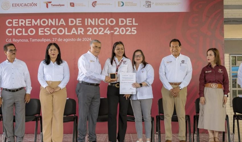 Reynosa, Tamaulipas.- Reafirmando el compromiso del Gobierno del Estado que dirige Américo Villarreal Anaya, de fortalecer, promover e impulsar una educación universal, de calidad y con equidad, la secretaria de Educación de Tamaulipas, Lucía Aimé Castillo Pastor, presidió la ceremonia de inauguración del ciclo escolar 2024-2025 en el Sistema de Educación Dual Media Superior, en las instalaciones del Centro de Estudios Tecnológicos Industrial y de Servicios 71 (CETIS) de Reynosa.