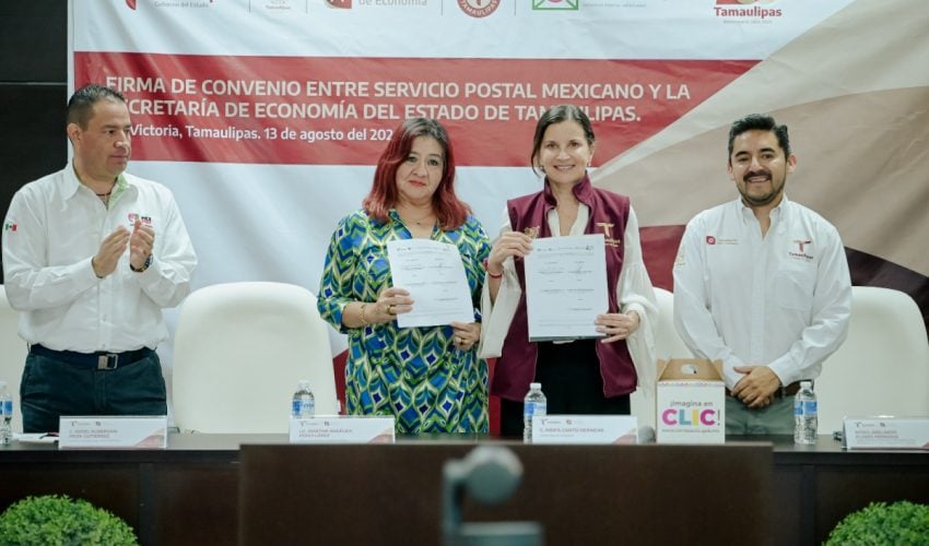 El acuerdo fue firmado por la secretaria de Economía, Ninfa Cantú Deándar y la directora regional Norte de SEPOMEX, Martha Angélica Pérez y contó con la presencia como testigo del subsecretario del Trabajo, Abelardo Flores y líderes de organismos empresariales de Tamaulipas.