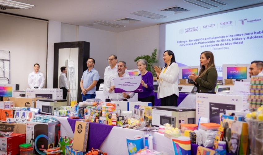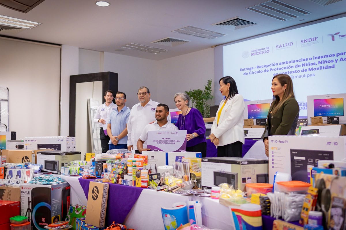 Ciudad Victoria, Tamaulipas. En las instalaciones del DIF estatal, la presidenta del Sistema DIF Tamaulipas, María de Villarreal, llevó a cabo la entrega de ambulancias y paquetes de insumos para la habilitación de los “Círculos de Protección para Niñas, Niños y Adolescentes en Contexto de Movilidad en Tamaulipas”, ubicados en Nuevo Laredo, Reynosa y Matamoros, municipios estratégicos por su ubicación geográfica y flujo migratorio.