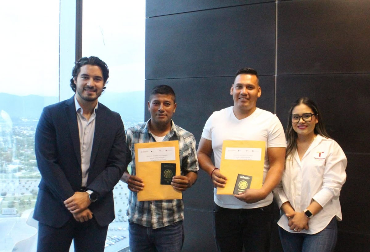 Ciudad Victoria, Tamaulipas.- El secretario del Trabajo y Previsión Social de Tamaulipas, Gerardo Illoldi hizo entrega de dos sobres de viaje para trabajadores contratados por empresas de Florida en Estados Unidos, mediante el mecanismo de movilidad laboral (Programa de trabajadores extranjeros temporales), un programa que ha logrado satisfacer la demanda de mano de obra en el sector agrícola, significando con ello una esperanza de mejorar la calidad de vida para las y los compatriotas.