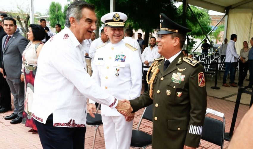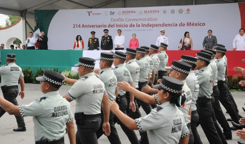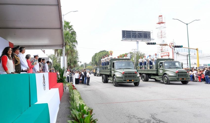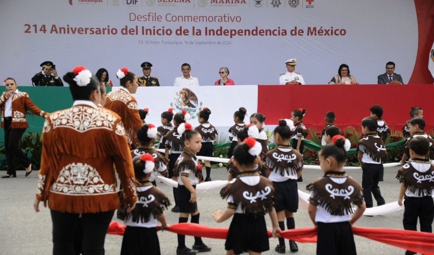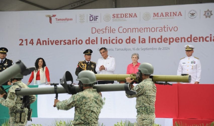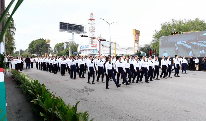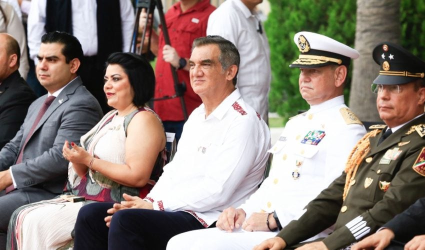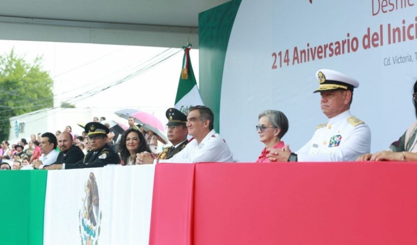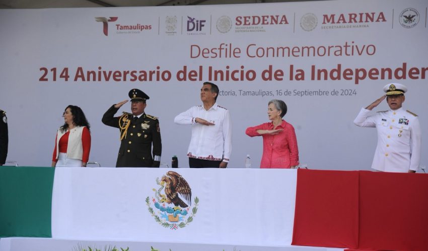 Acompañado por la presidenta del DIF Tamaulipas, María de Villarreal, así como por el general Julio César Islas Sánchez, comandante de la 48 Zona Militar, y el contralmirante Carlos Eduardo L’Eglise Escamilla, comandante de la Primera Región Naval, el gobernador presenció el paso de los contingentes a lo largo de la Avenida Tamaulipas, donde miles de familias tamaulipecas se congregaron.