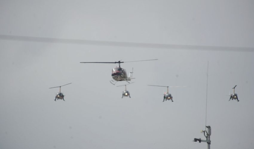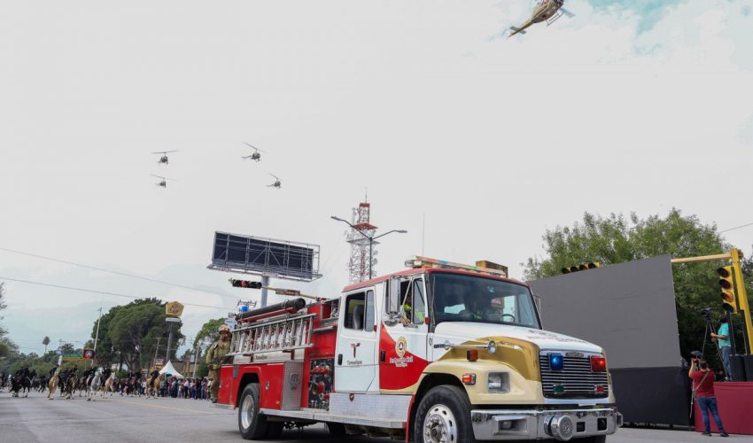 Uno de los momentos más aplaudidos por los asistentes fue cuando cinco helicópteros de la Secretaría de Seguridad Pública sobrevolaron el cielo victorense, uniéndose a ellos en un segundo vuelo un helicóptero de la Coordinación Estatal de Protección Civil.