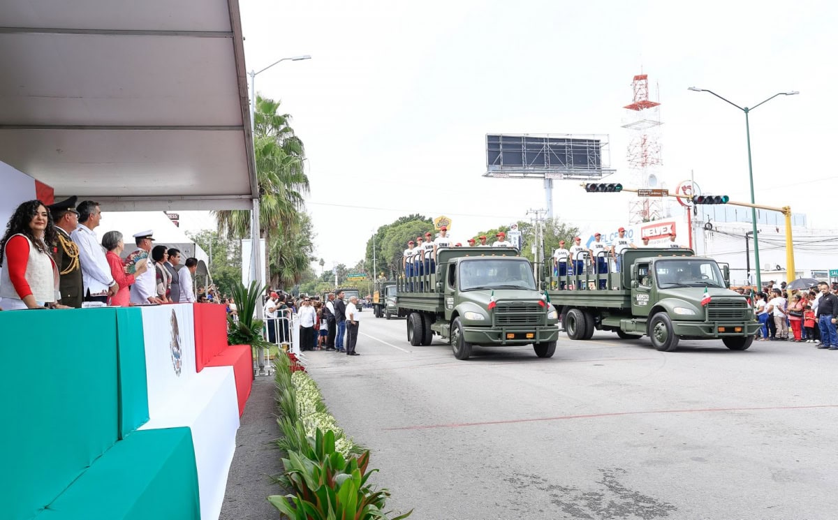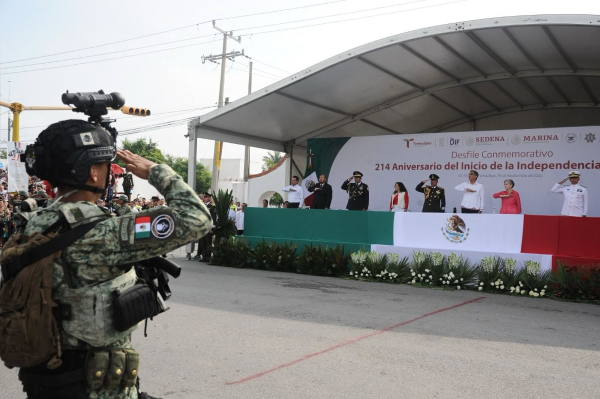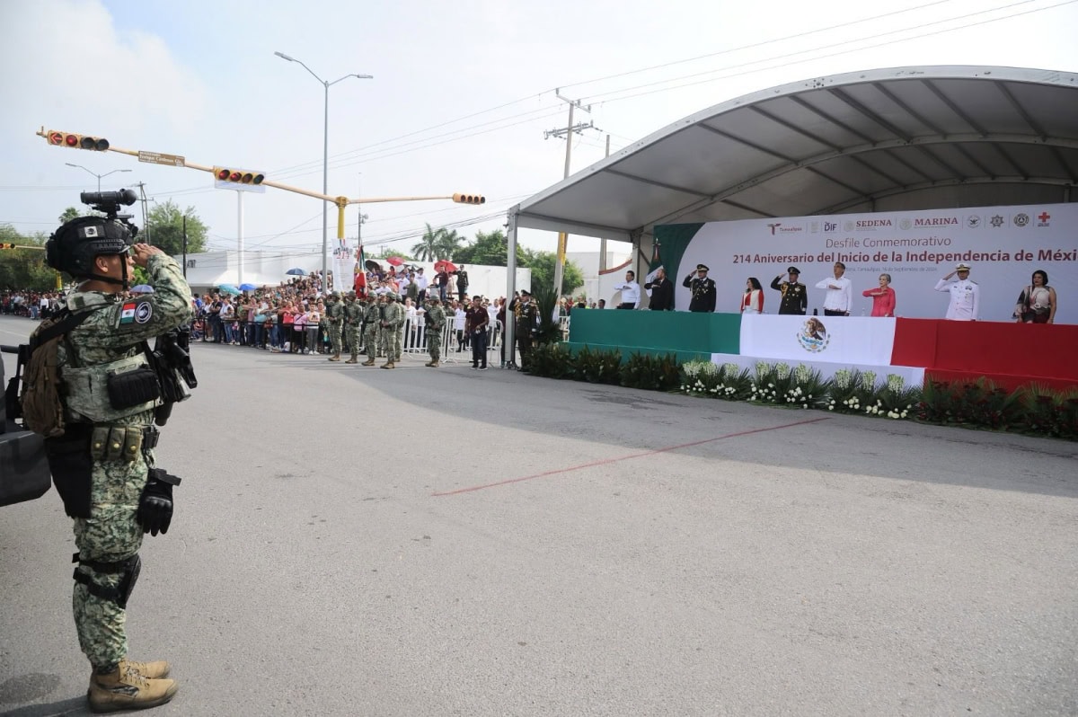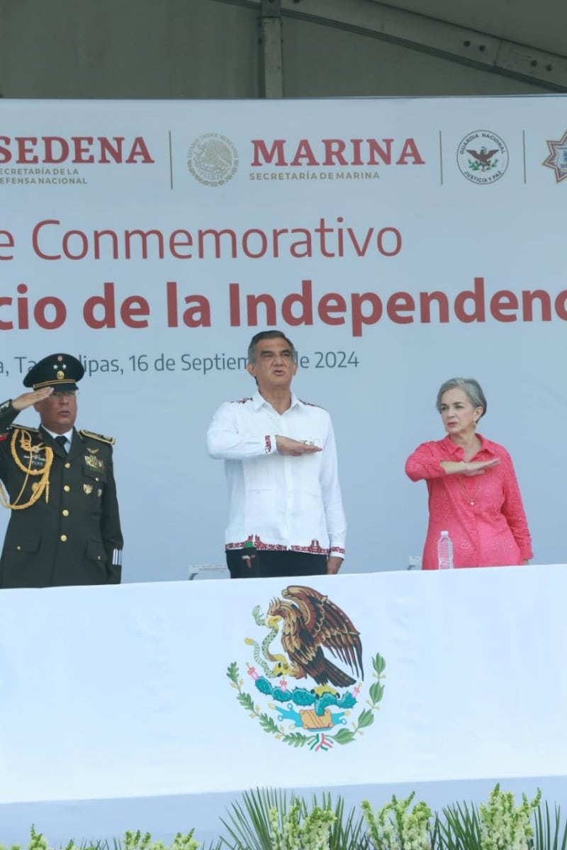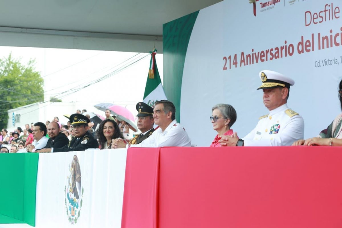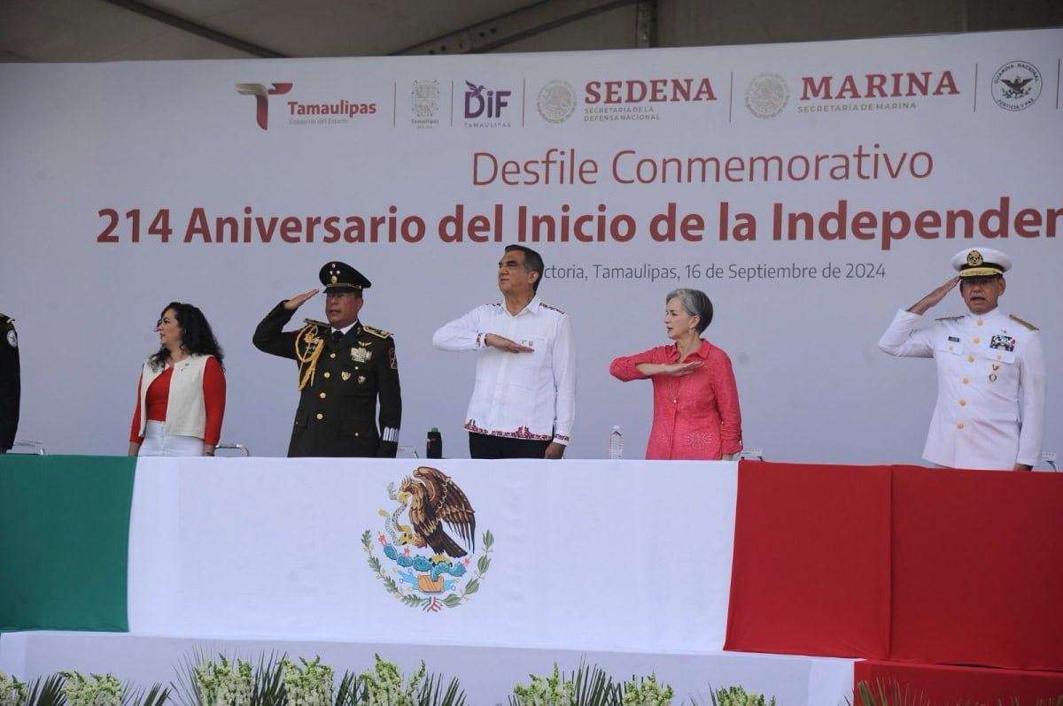 Acompañado por la presidenta del DIF Tamaulipas, María de Villarreal, así como por el general Julio César Islas Sánchez, comandante de la 48 Zona Militar, y el contralmirante Carlos Eduardo L’Eglise Escamilla, comandante de la Primera Región Naval, el gobernador presenció el paso de los contingentes a lo largo de la Avenida Tamaulipas, donde miles de familias tamaulipecas se congregaron.