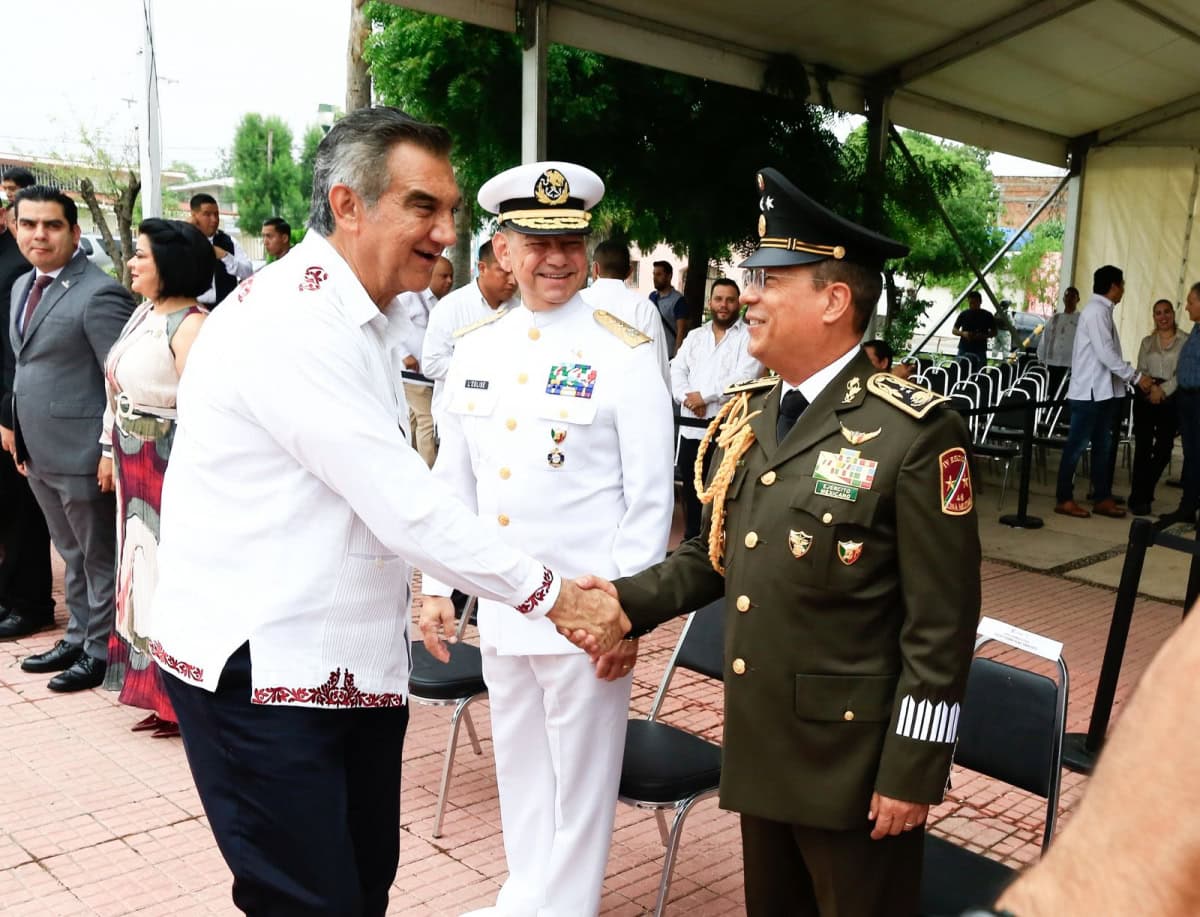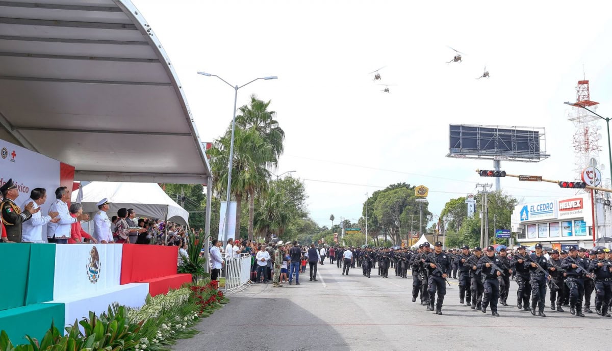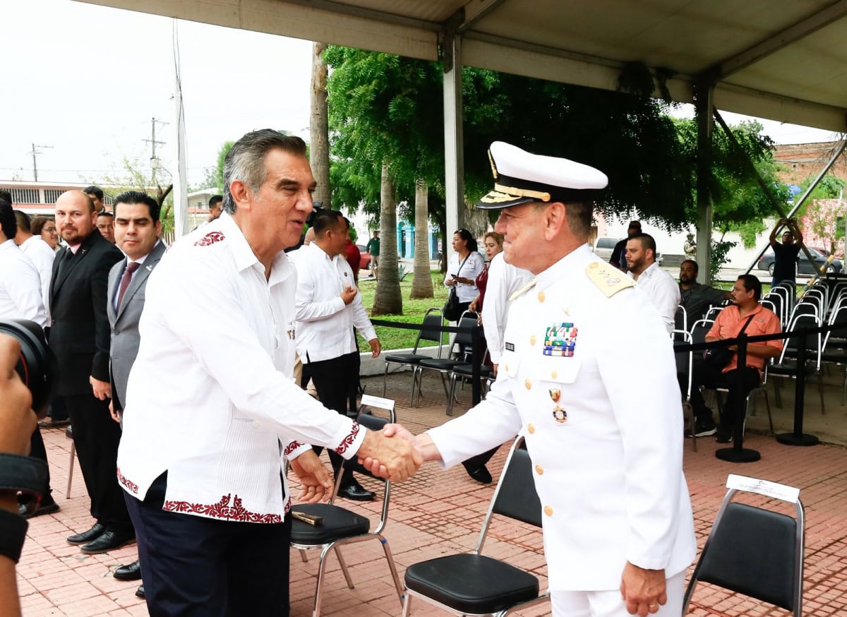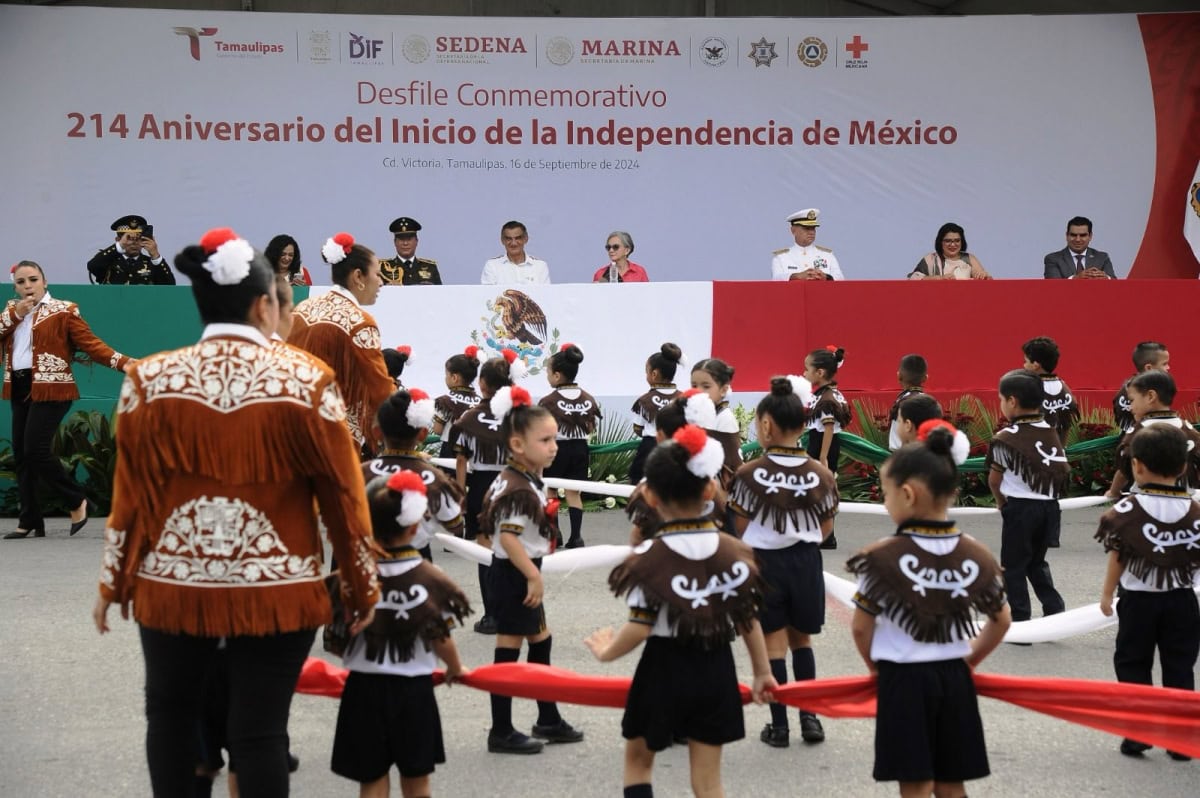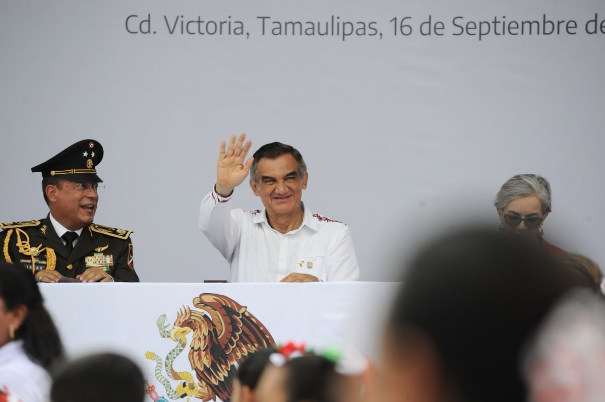 Acompañado por la presidenta del DIF Tamaulipas, María de Villarreal, así como por el general Julio César Islas Sánchez, comandante de la 48 Zona Militar, y el contralmirante Carlos Eduardo L’Eglise Escamilla, comandante de la Primera Región Naval, el gobernador presenció el paso de los contingentes a lo largo de la Avenida Tamaulipas, donde miles de familias tamaulipecas se congregaron.
