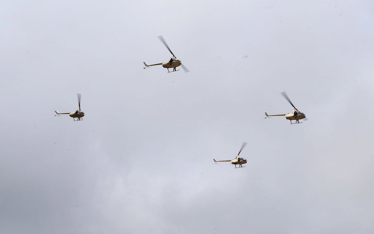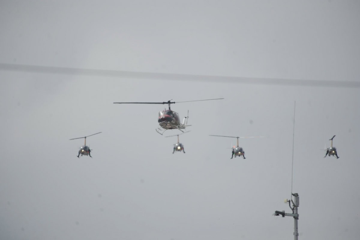 Uno de los momentos más aplaudidos por los asistentes fue cuando cinco helicópteros de la Secretaría de Seguridad Pública sobrevolaron el cielo victorense, uniéndose a ellos en un segundo vuelo un helicóptero de la Coordinación Estatal de Protección Civil.