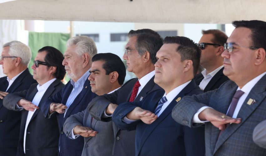 Apodaca, N.L.-El gobernador de Tamaulipas, Américo Villarreal Anaya, acudió esta mañana a la toma de posesión y protesta de bandera de los Generales de Brigada D.E.M Juan José Gómez Ruiz, comandante de la IV Región Militar (Escobedo, N.L); Fernando Colchado Gómez, comandante de la Octava Zona Militar (Reynosa) y Enrique García Jaramillo, comandante de la 48/a Zona Militar (Cd. Victoria).