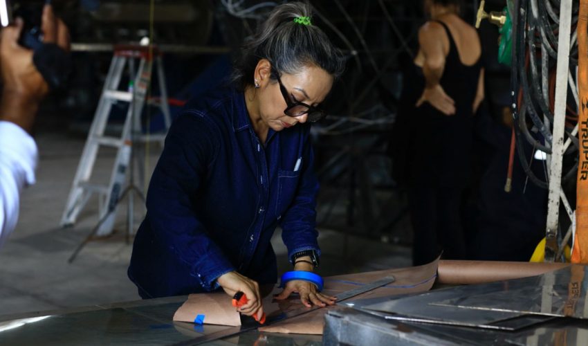 Por su parte, la directora del proyecto, María Fernanda Saiz, explica los detalles técnicos de la obra monumental; “no hay una sola pieza igual, toda está hecha a mano, cada una de ellas es distinta, algunas llevan dobleces, otras no”.