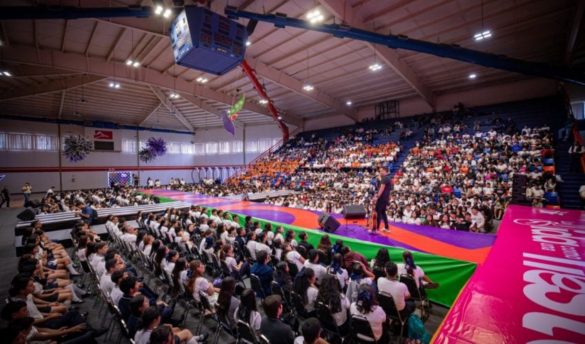 Ante miles de jóvenes en el gimnasio multidisciplinario de la UAT Victoria, el músico de Los Claxons compartió experiencias y vivencias de su carrera personal y profesional