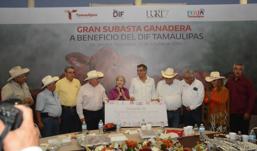 Ciudad Victoria, Tamaulipas.- Los ganaderos de Tamaulipas entregaron al gobernador Américo Villarreal Anaya y a la presidenta del DIF Estatal, doctora María de Villarreal, un donativo de 1,372,000 pesos en beneficio de los programas de esta noble institución. El donativo es el resultado de la gran subasta ganadera realizada este sábado, en el marco de la Feria Tamaulipas 2024.