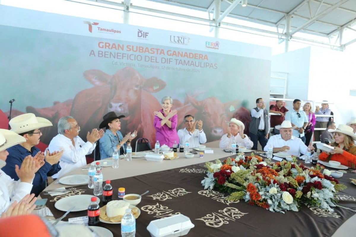 Ciudad Victoria, Tamaulipas.- Los ganaderos de Tamaulipas entregaron al gobernador Américo Villarreal Anaya y a la presidenta del DIF Estatal, doctora María de Villarreal, un donativo de 1,372,000 pesos en beneficio de los programas de esta noble institución. El donativo es el resultado de la gran subasta ganadera realizada este sábado, en el marco de la Feria Tamaulipas 2024.