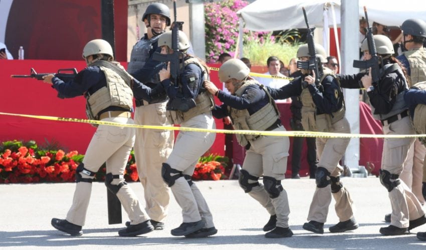 Desfilaron cadetes del curso de formación inicial para Guardia Estatal y cadetes de la Fiscalía General de Justicia, quienes mostraron una intervención en casa habitación; ataque con arma blanca en forma de pica hielo y ataque en la zona abdominal, así como técnicas de desarme de amague con armas de fuego.