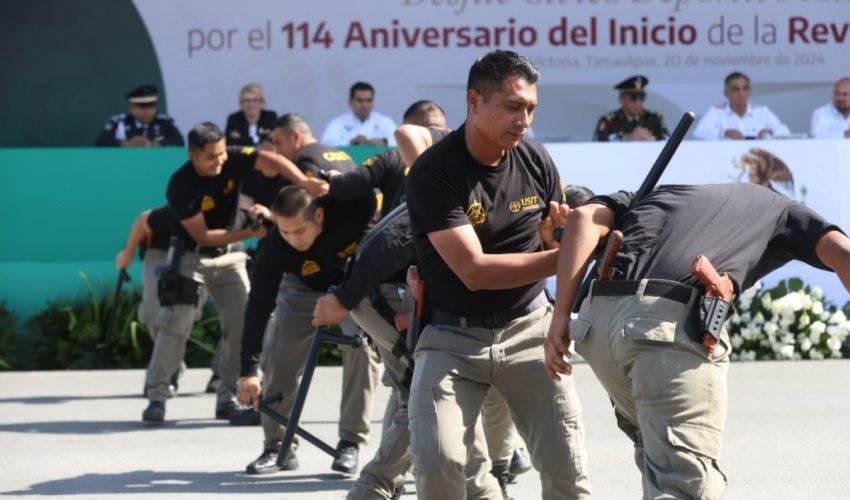 Ante la presencia del gobernador Américo Villarreal Anaya, cadetes, estudiantes, instructores y personal docente, entre otros, muestran parte de las técnicas y tácticas aprendidas en la institución