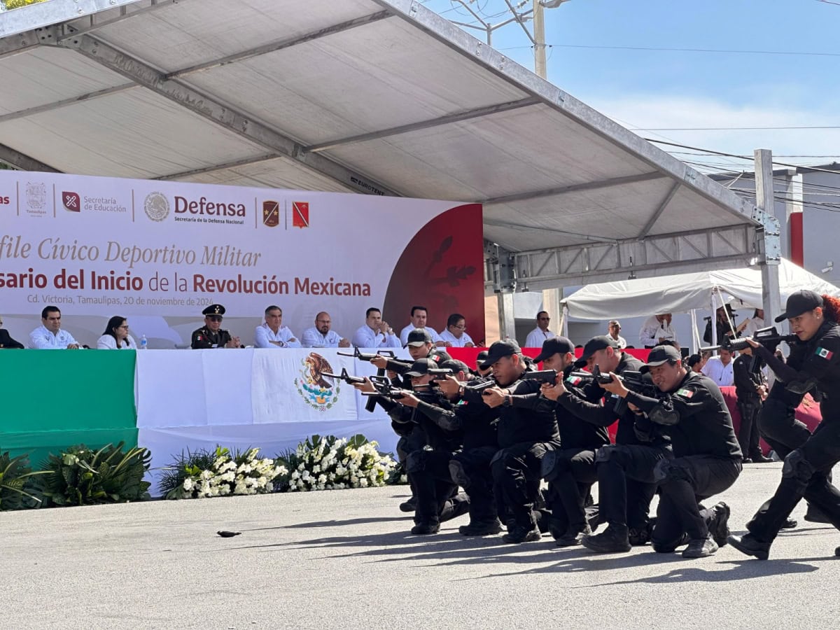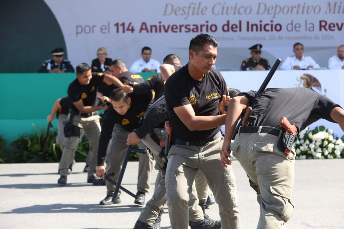 Ante la presencia del gobernador Américo Villarreal Anaya, cadetes, estudiantes, instructores y personal docente, entre otros, muestran parte de las técnicas y tácticas aprendidas en la institución