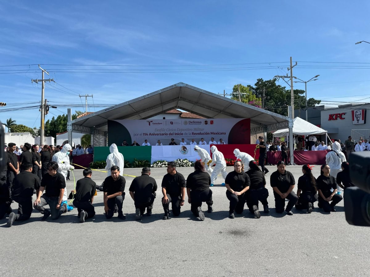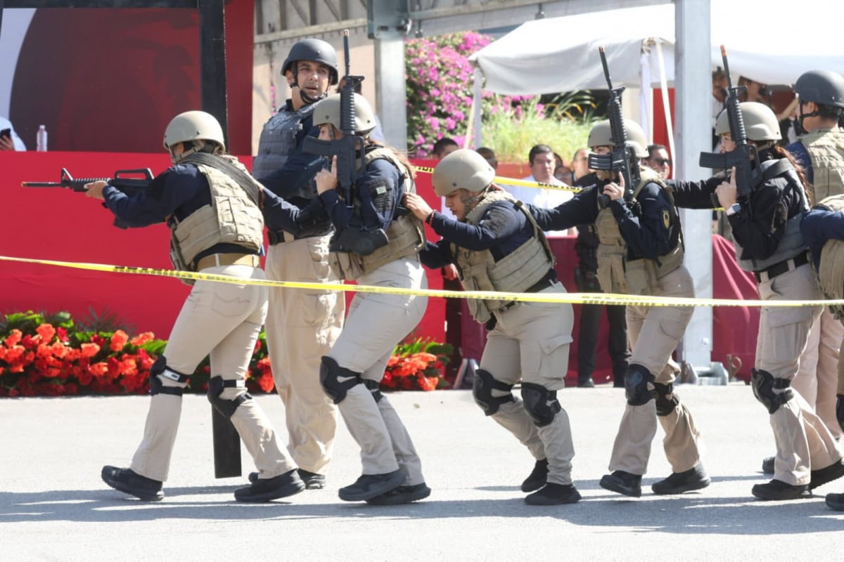 Desfilaron cadetes del curso de formación inicial para Guardia Estatal y cadetes de la Fiscalía General de Justicia, quienes mostraron una intervención en casa habitación; ataque con arma blanca en forma de pica hielo y ataque en la zona abdominal, así como técnicas de desarme de amague con armas de fuego.