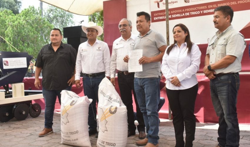 Por su parte, Eliseo Camacho Nieto, subsecretario de Desarrollo Agrícola refirió que «desde la administración del gobernador Américo Villarreal Anaya, hemos estado juntos en esta lucha y ante esta problemática, hoy estamos aquí con ustedes para hacer entrega de semilla de trigo y de sembradoras, decirles que con esta semilla iniciamos el plan piloto en la búsqueda de alternativas que suplan el plantío de sorgo, sabemos de la importancia de la región como lo es el grano rojo».