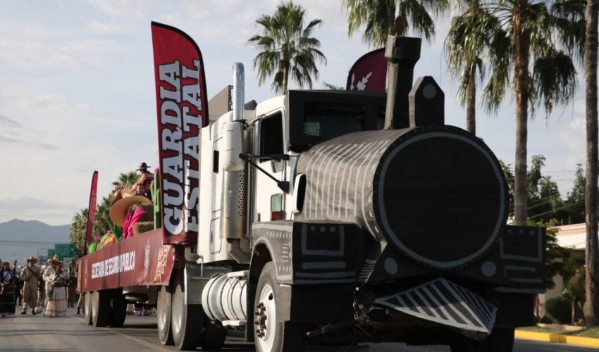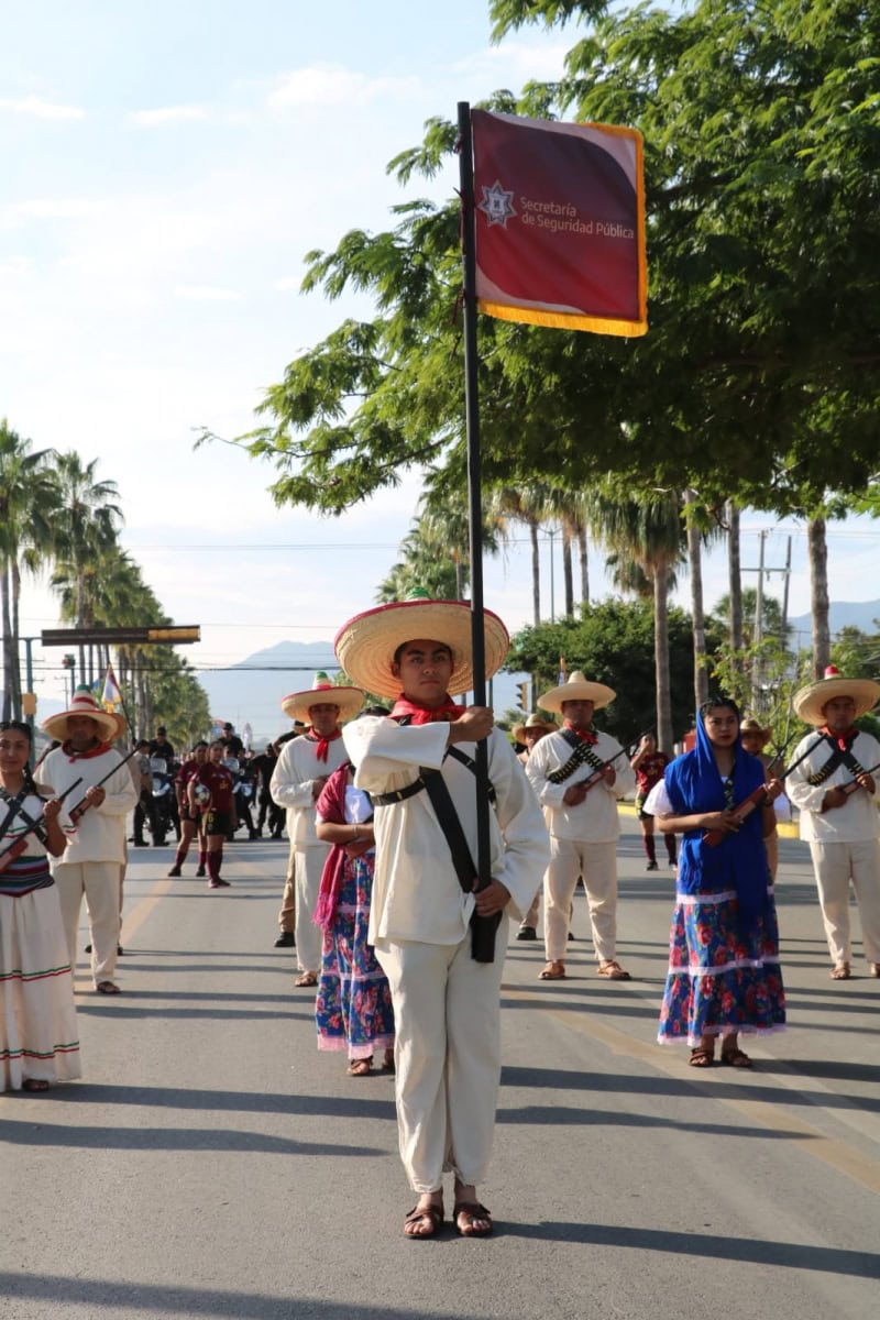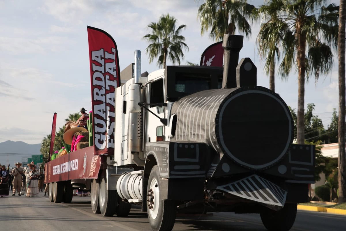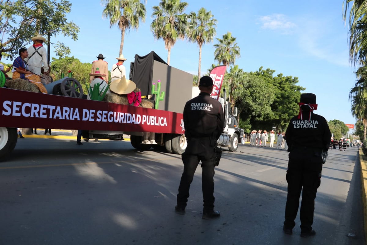Marcando la cadencia, la Banda de Guerra de la Guardia Estatal avanzó sobre la Avenida Tamaulipas y dio paso al carro alegórico que proyectó una reseña histórica sobre la participación de personajes oriundos de la entidad en la lucha armada del 20 de noviembre de 1910 destacando el papel de las mujeres conocidas como “adelitas” o “soldaderas”, mismas que fueron representadas por colaboradoras de esta dependencia.