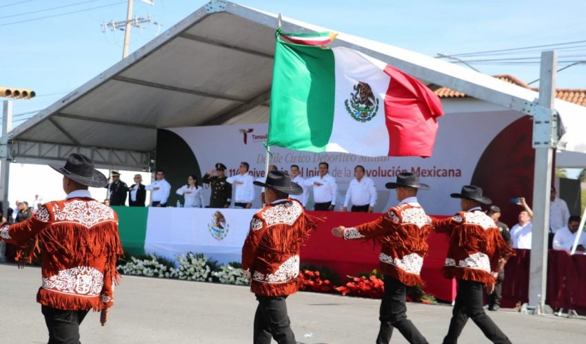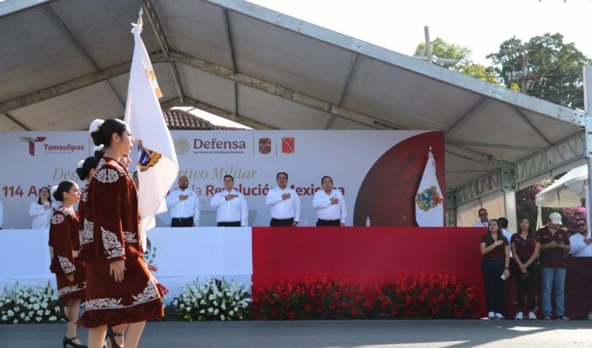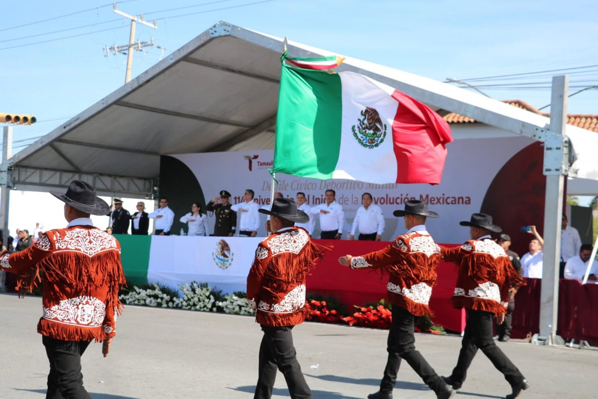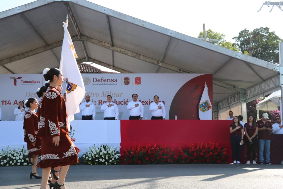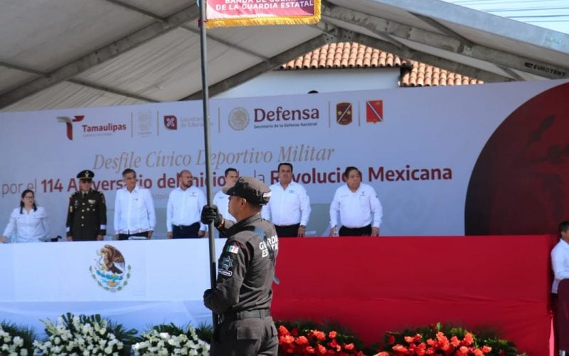 Ante el gobernador, Américo Villarreal Anaya; el titular de la SSPT, Sergio Hernando Chávez García, integrantes de la línea de honor y público en general, desfiló el contingente encabezado por las escoltas varonil y femenil, quienes portaron la bandera nacional y el escudo de Tamaulipas, respectivamente.